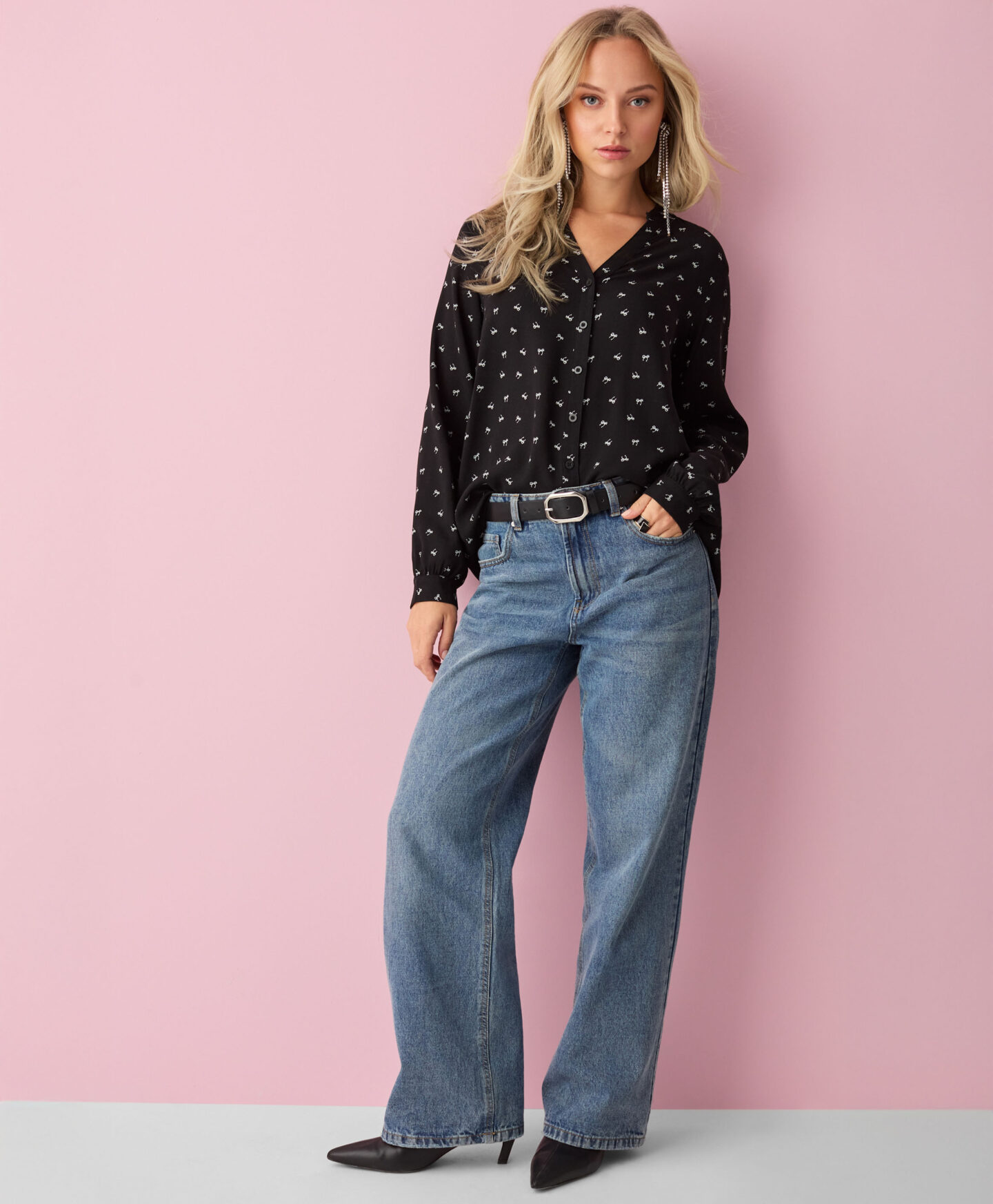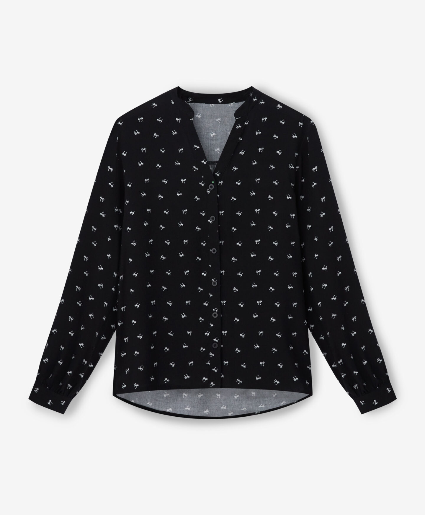 Cămașa pentru femei din 100% viscoză, cu mâneci lungi, este decorată cu un model subtil de funde. Este ușoară, vaporoasă și romantică. Perfectă nu doar pentru zi cu zi, ci și pentru ocazii speciale. Țesătura respirabilă o face ideală de purtat sub un sacou, pulover sau cardigan.
