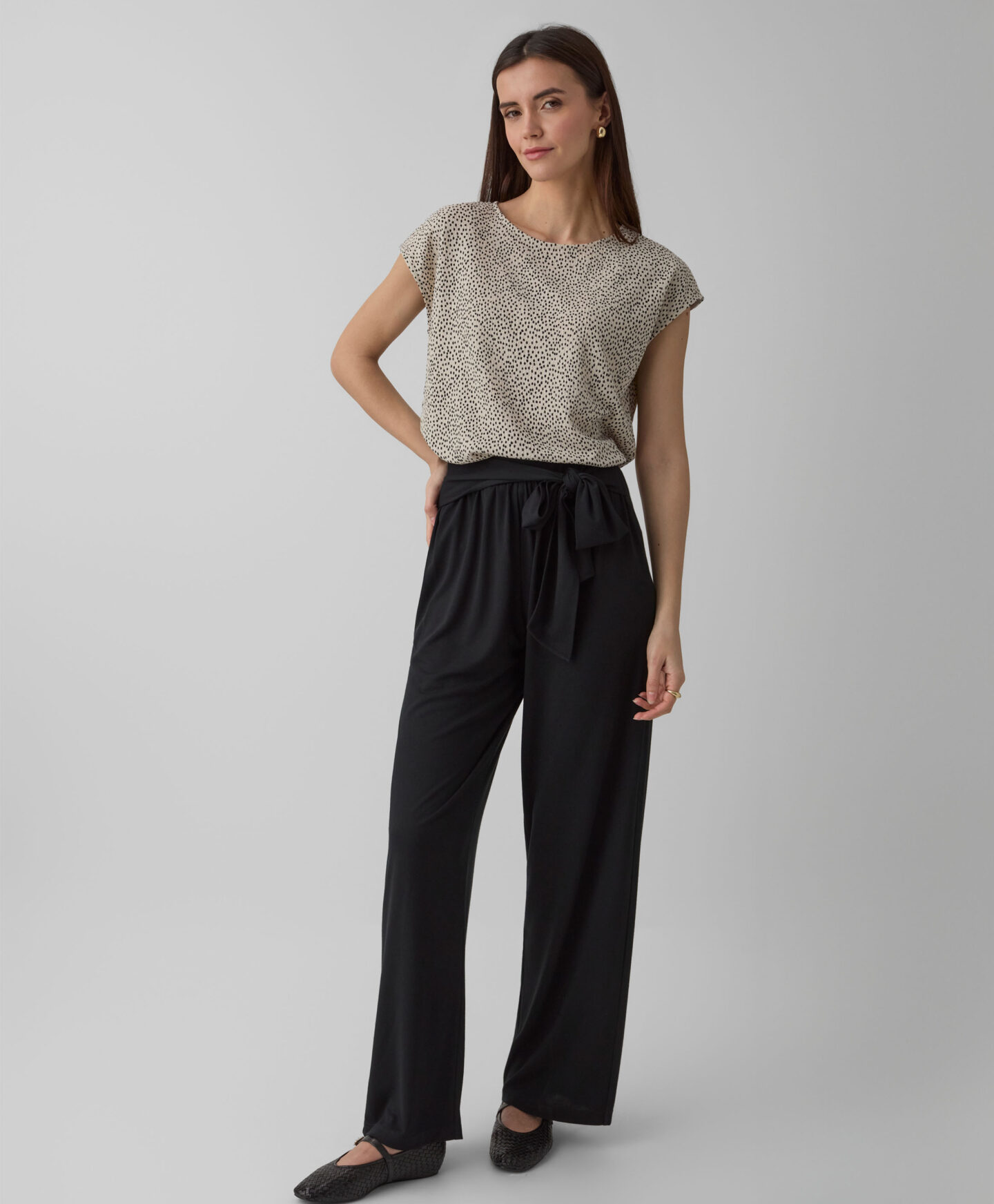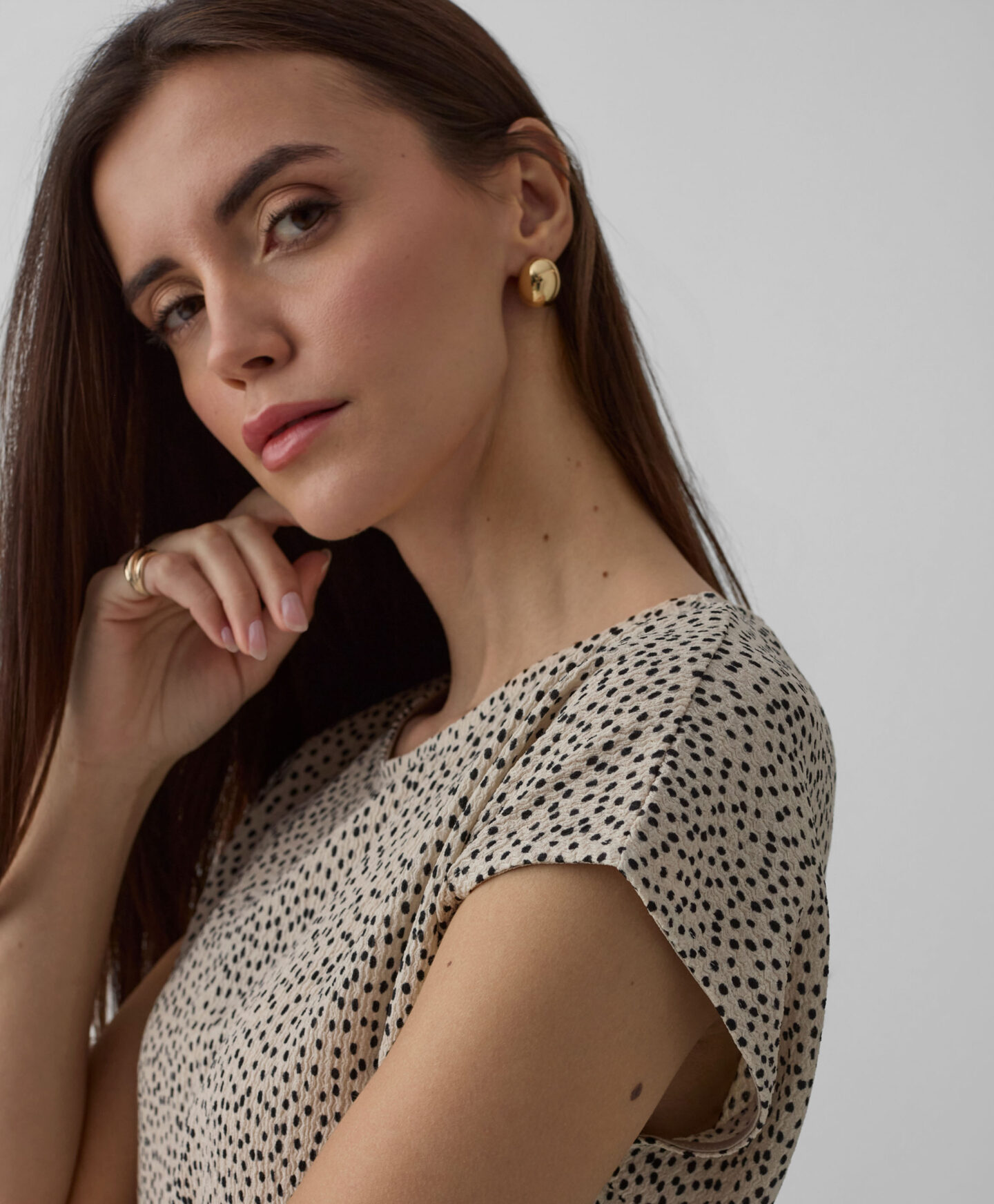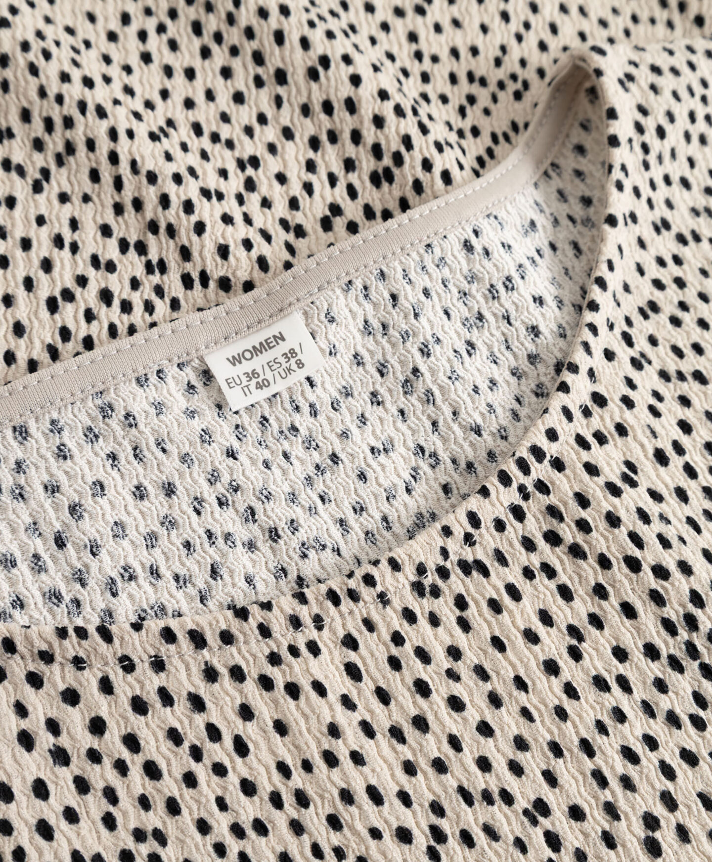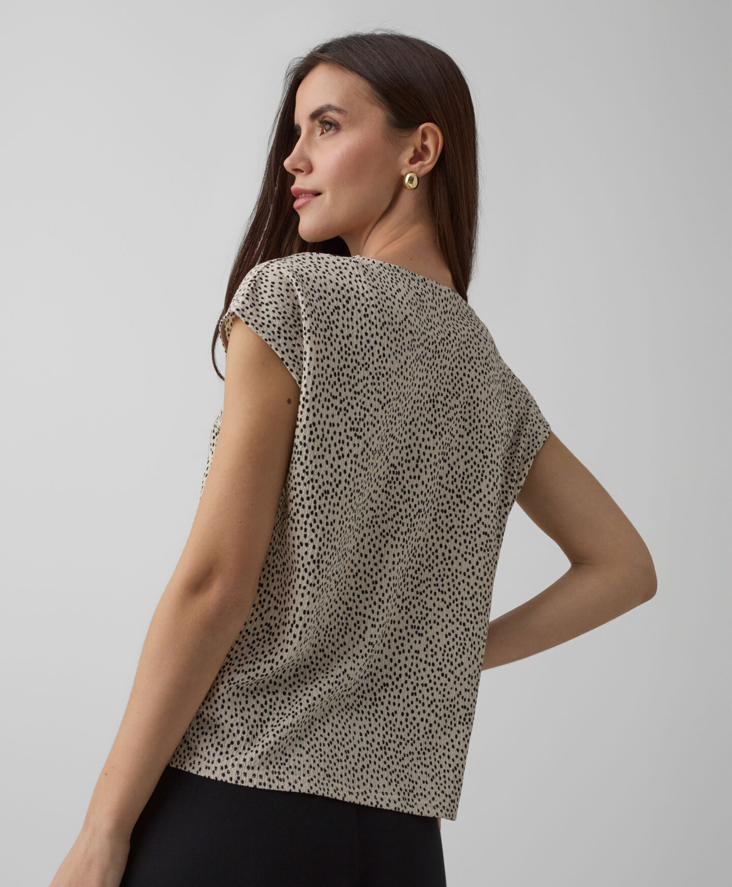 Cămașa pentru femei cu textură încrețită și model delicat poate fi purtată în set sau separat. Se potrivește atât cu blugi, cât și cu pantaloni eleganți. Mânecile scurte o fac ideală pentru perioada de tranziție.
