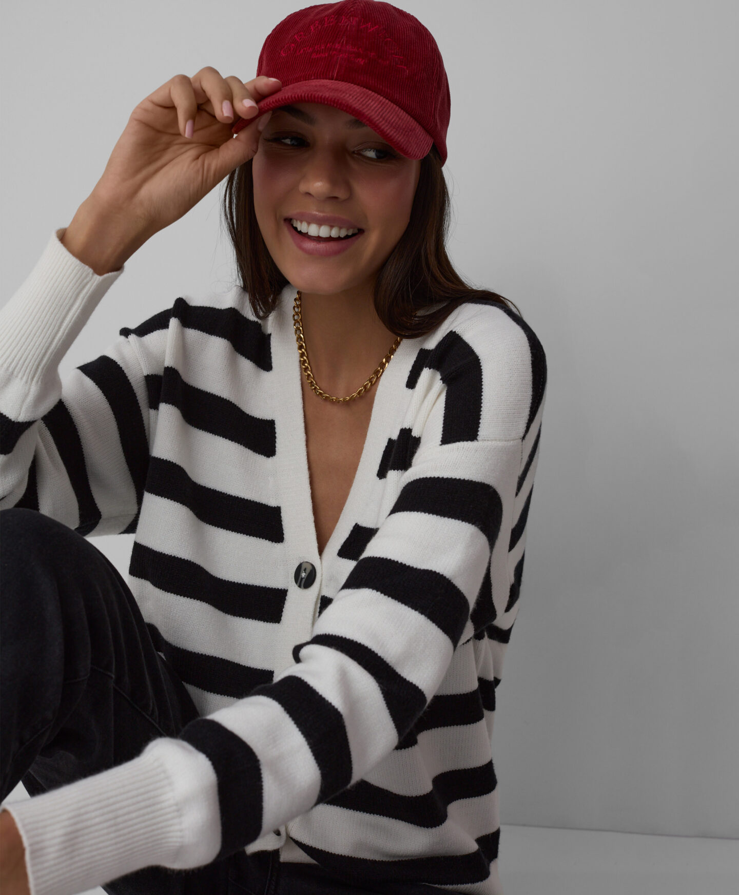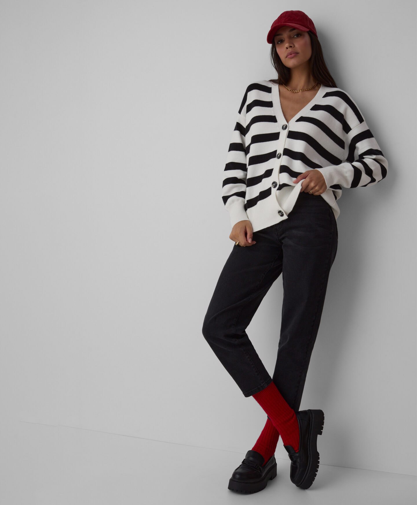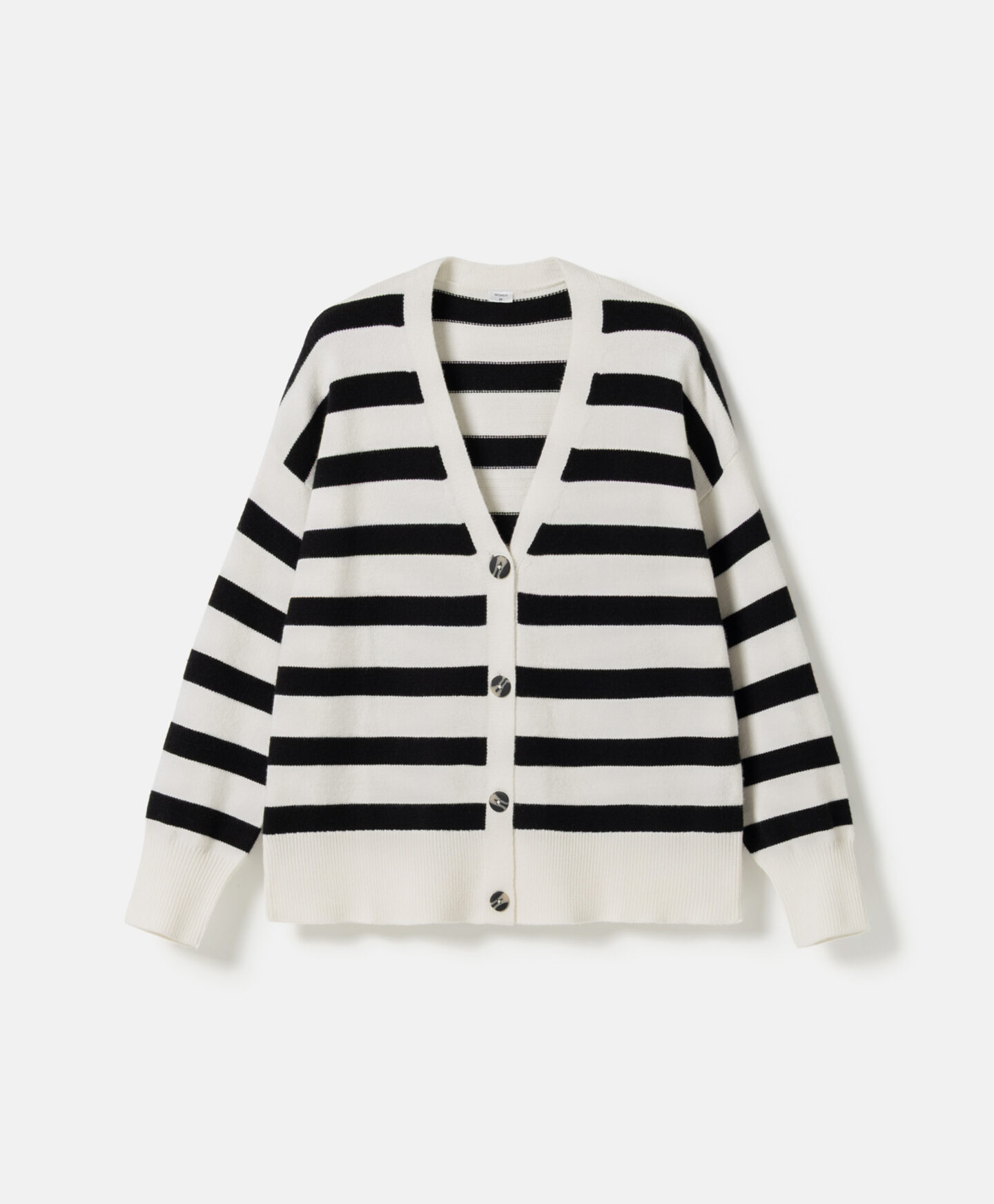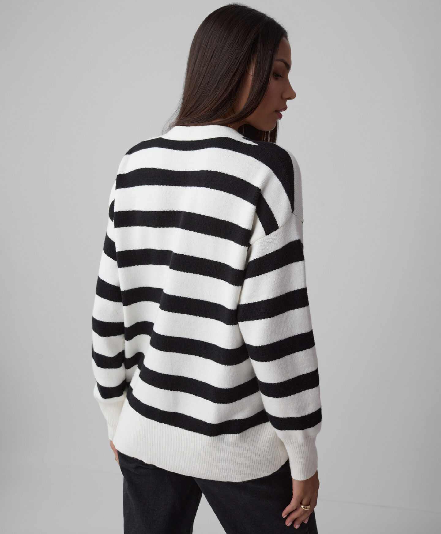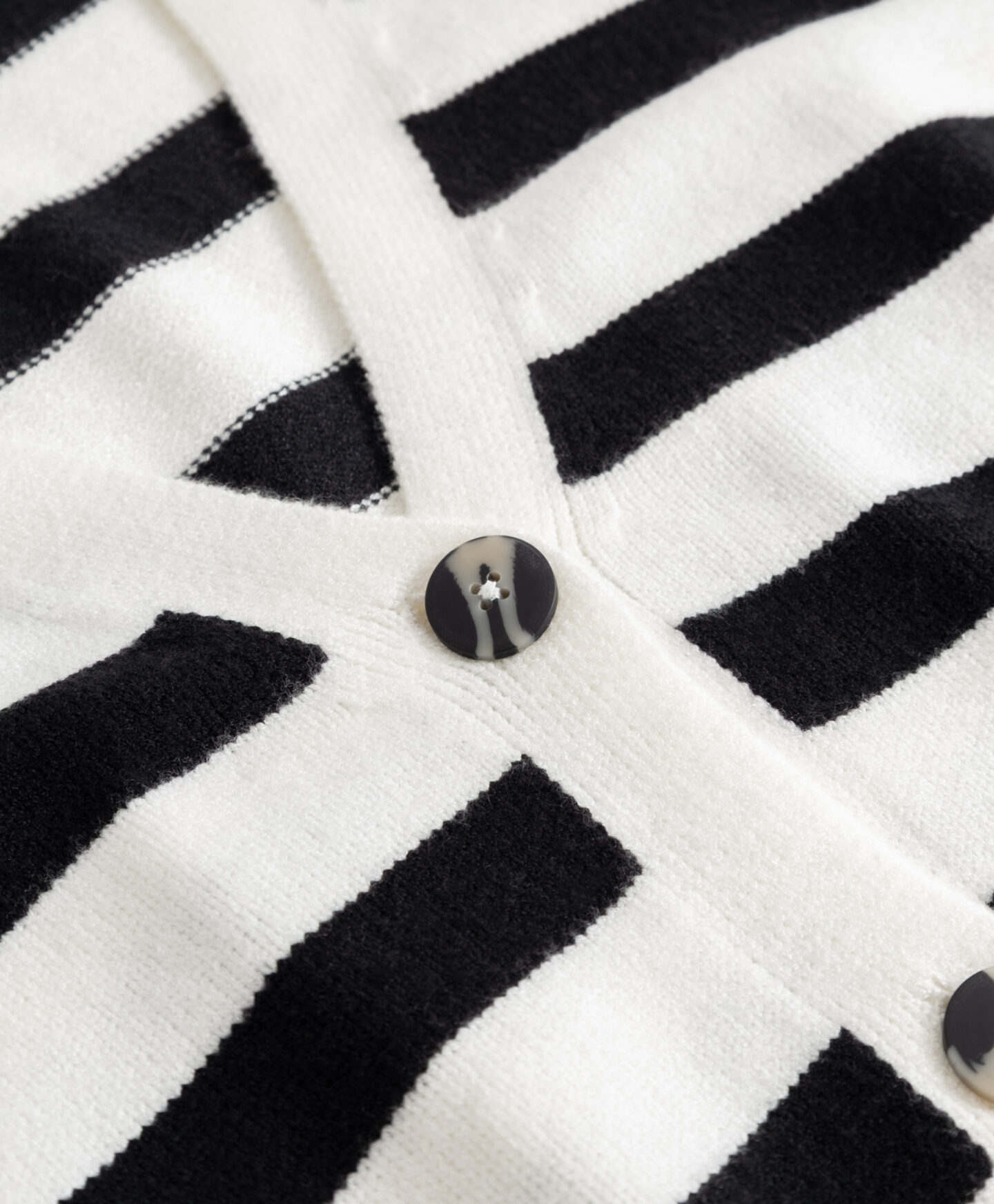 Cardiganul pentru femei cu dungi, în combinație alb-negru și croială lejeră, este ideal pentru stiluri clasice și confortabile. Modelul atemporal se potrivește cu pantaloni eleganți sau blugi. Materialul plăcut la atingere oferă căldură și confort în zilele răcoroase.