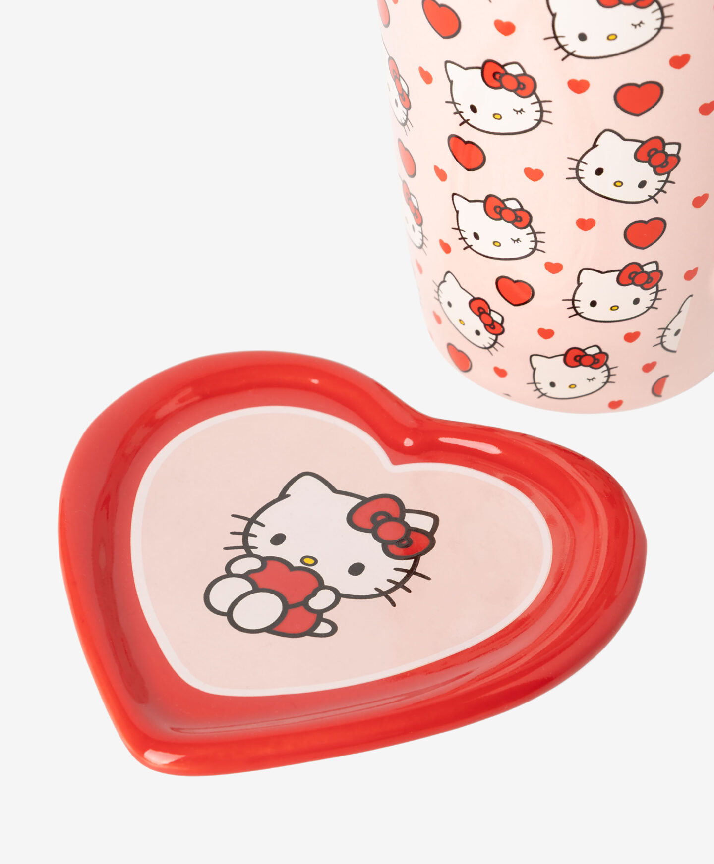 Ceașca cu farfurioară cu licență Hello Kitty impresionează prin designul său unic. Este ideală pentru savurarea ceaiului sau cafelei, iar farfurioara în formă de inimă adaugă un plus de farmec.