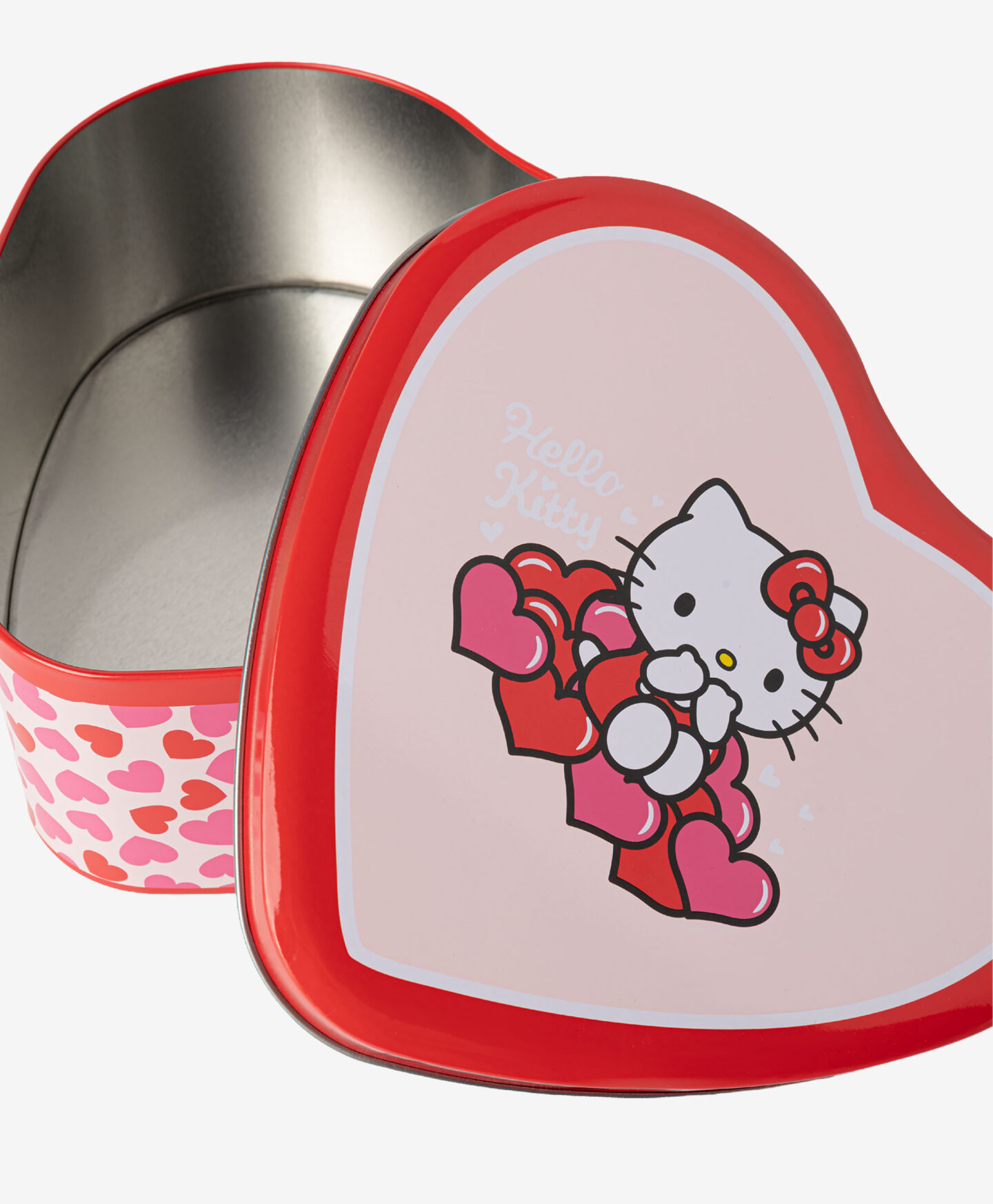 Cutia de biscuiți cu licență Hello Kitty, prevăzută cu capac, păstrează produsele de patiserie proaspete pentru mai mult timp. Este ideală pentru depozitarea biscuiților, pralinelor sau bomboanelor, iar forma de inimă și designul cu personajul adorabil o transformă într-un accesoriu decorativ pentru bucătărie.