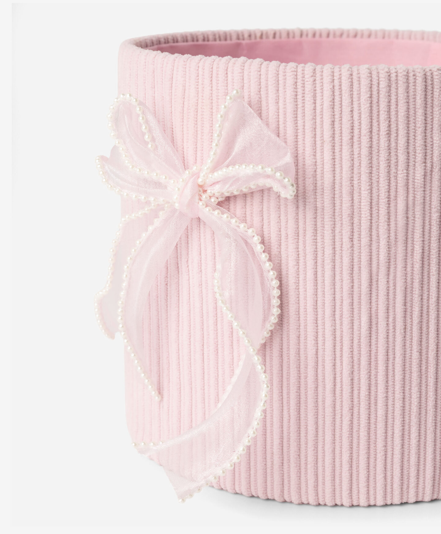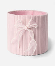 Cutia rotundă cu fundă este ideală pentru depozitarea obiectelor mici sau ca element decorativ.