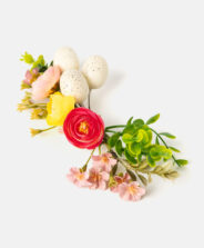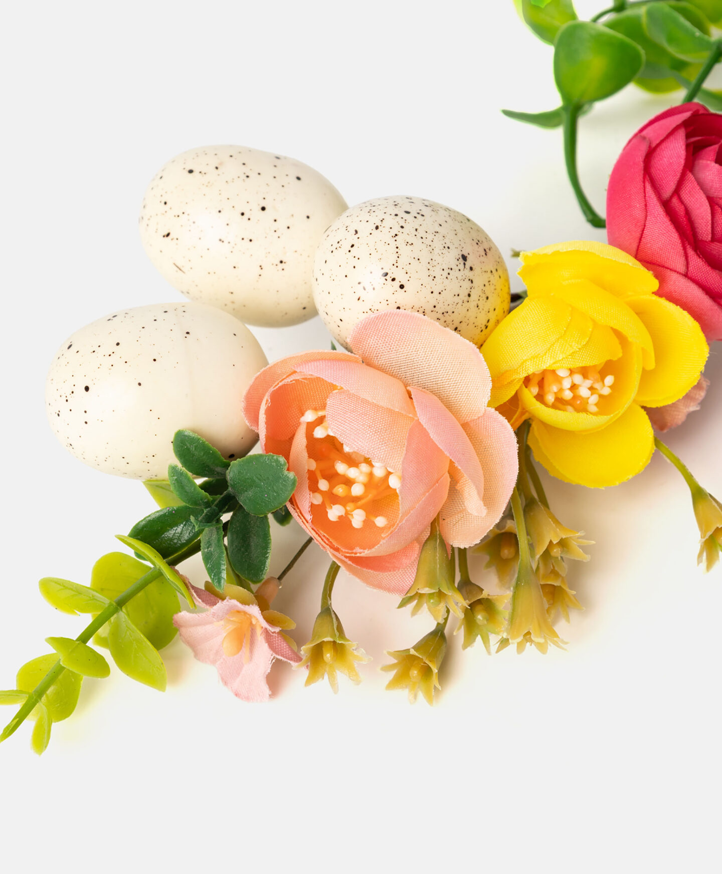 Coronița colorată pentru coș este un aranjament gata făcut, pe care îl poți pune pe mânerul coșului de Paște. Este ușoară, durabilă și rezistentă la intemperii. Reprezintă o alternativă excelentă la florile proaspete, care pot fi greu de găsit în această perioadă. Sunt disponibile trei modele.