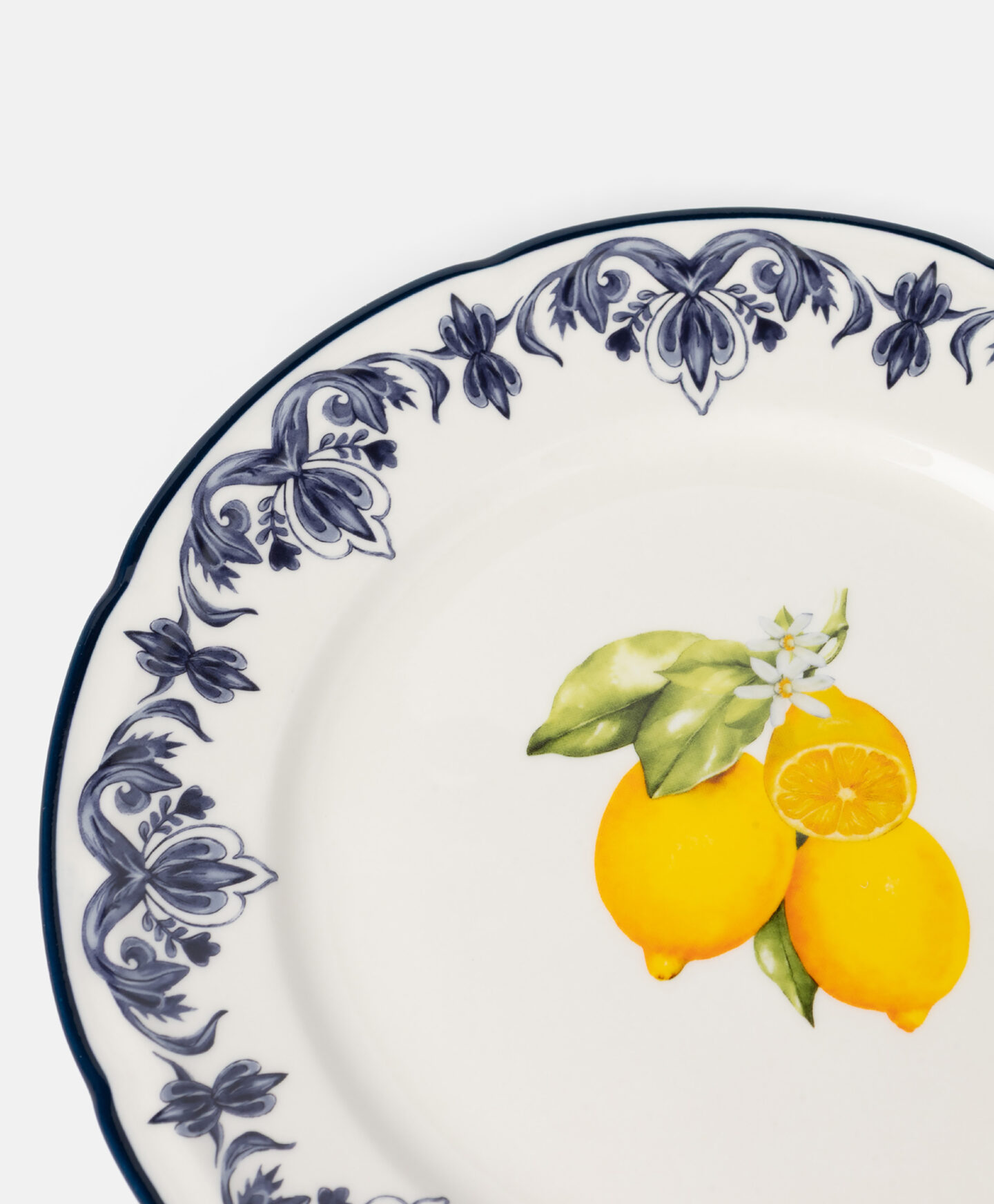 Farfuria pentru desert din gresie, cu model de lămâi, este un plus elegant pentru masa ta. Modelul inspirat de peisajul mediteranean îi conferă un aspect decorativ deosebit. Este durabilă, rezistentă și ușor de curățat, perfectă pentru deserturi, fructe sau prăjituri.