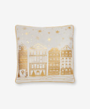 Fața de pernă cu case este un accesoriu care amintește de orașele europene de Crăciun. Clădirile aurii imprimate pe un fundal deschis oferă pernei un caracter luxos și de basm. Asociată cu alte decorațiuni aurii, creează un ansamblu elegant și coerent.