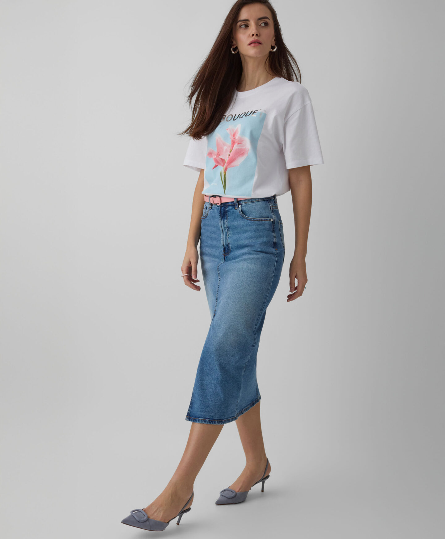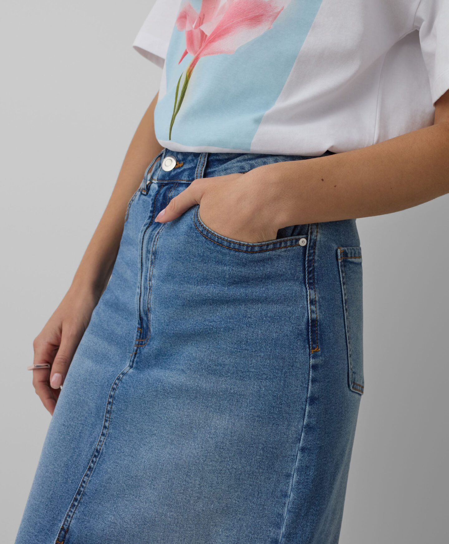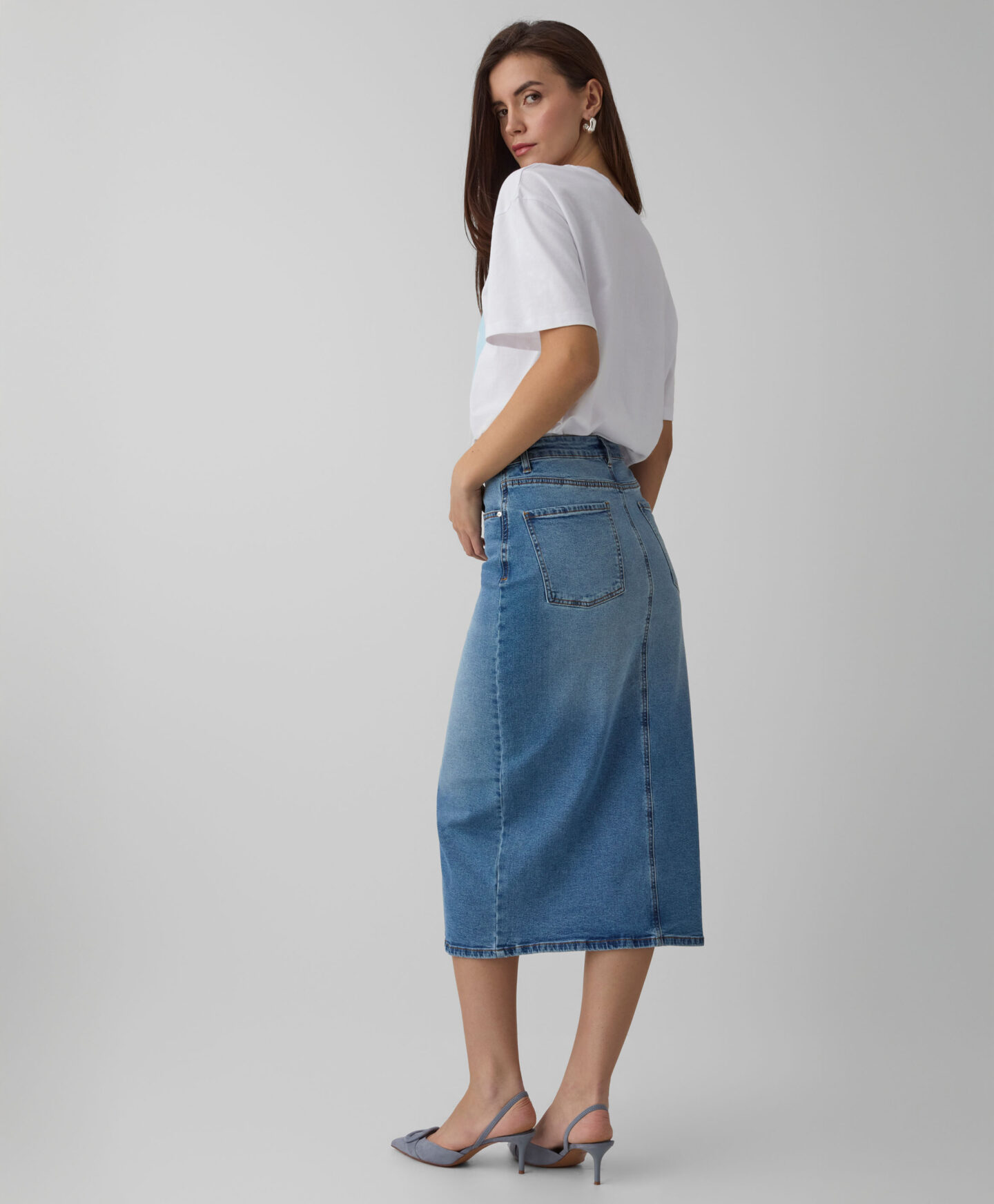 Fusta pentru femei din denim cu despicătură frontală pune în valoare silueta. Denim-ul atemporal se potrivește atât cu tricouri clasice, cât și cu cămăși elegante. Poate fi purtată cu încălțăminte sport pentru un look relaxat sau cu pantofi cu toc pentru un stil rafinat. Lungimea midi o face potrivită pentru orice ocazie.