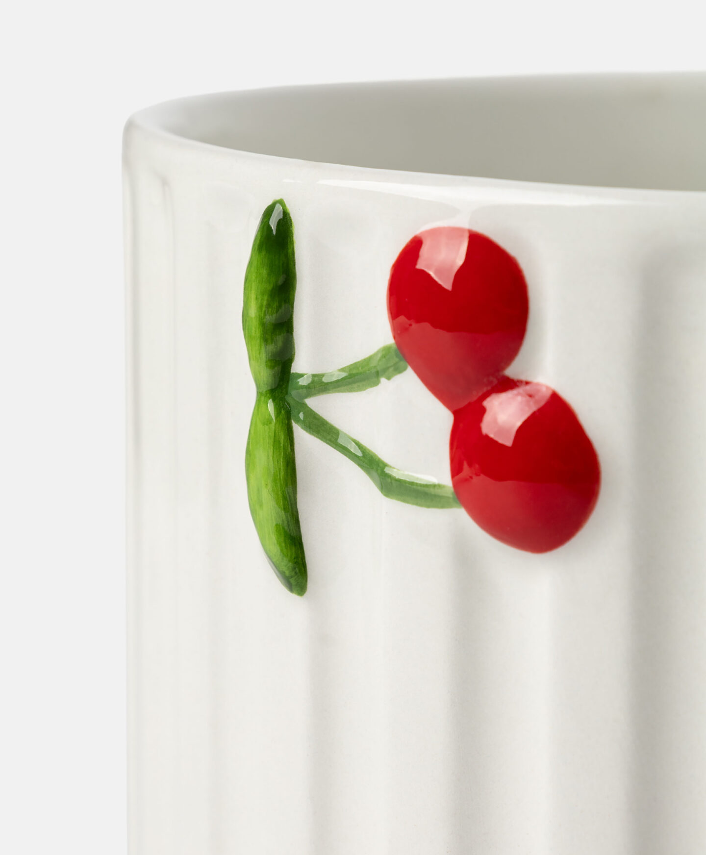 Ghiveciul din dolomit, cu model de cireșe, va evidenția frumusețea florilor tale. Albul clasic, combinat cu modelul fructat, se va remarca în orice interior și se va armoniza frumos cu verdeața plantelor. Dolomitul este durabil, rezistent la deteriorare și ușor de curățat.
