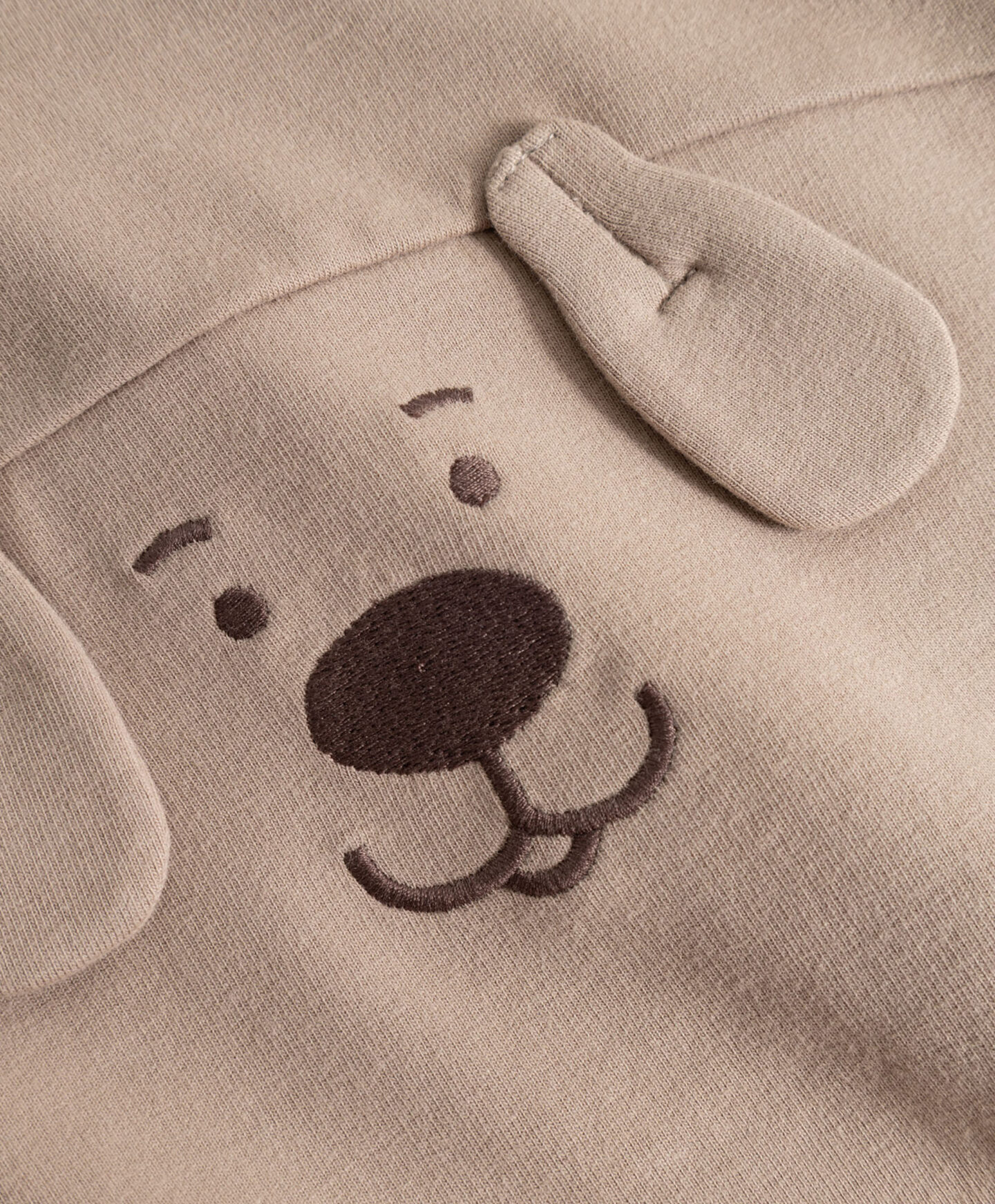 Hanoracul pentru băieți cu urechi 3D va arăta adorabil în fotografiile de familie. Imaginea cățelului din față atrage privirea și diferențiază piesa vestimentară. Materialul moale, cu conținut ridicat de bumbac, asigură confort încă din primele momente. Sunt disponibili și pantaloni sport asortați.