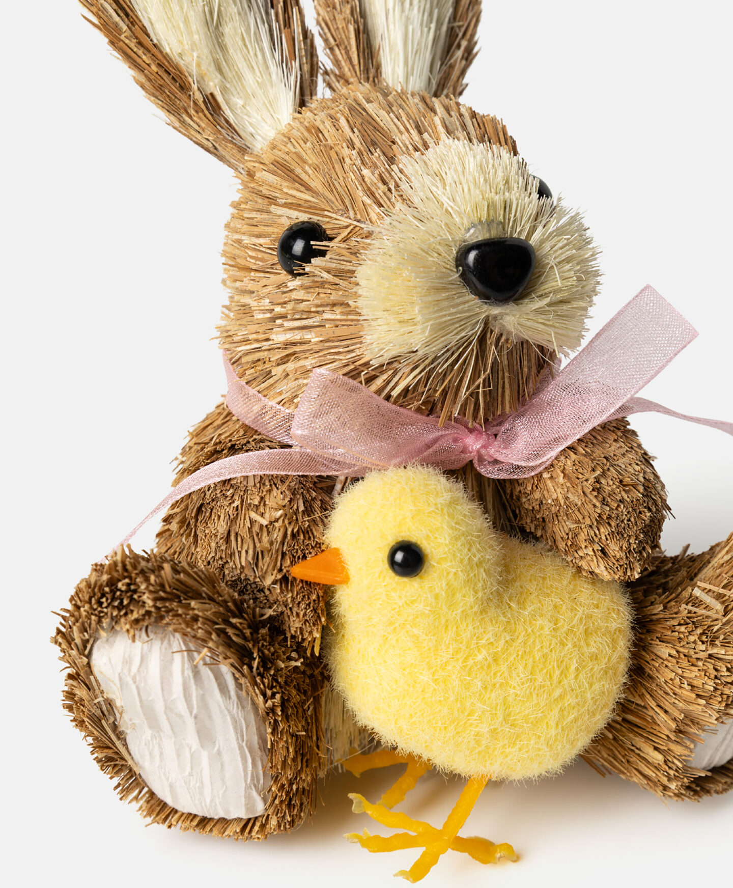 Iepurașul din paie cu puișor este o decorațiune fermecătoare, realizată parțial din materiale naturale, care se potrivește minunat atât în interioare rustice, cât și moderne. Iepurașul este ușor, durabil și complet sigur pentru copii și animale de companie. De asemenea, este un cadou frumos pentru oricine iubește accentele tematice de Paște.