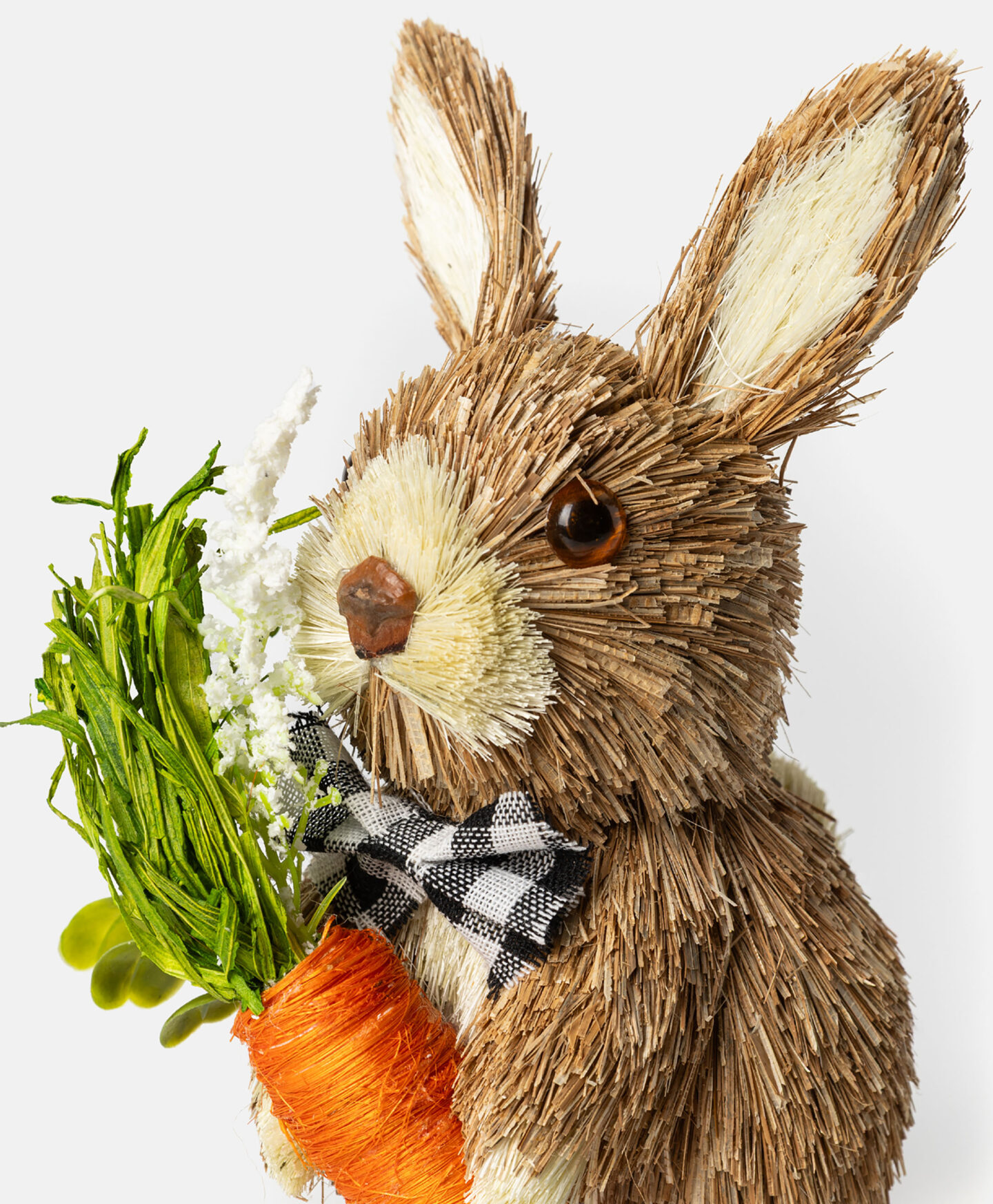 Iepurașul din paie cu morcov este o decorațiune fermecătoare, realizată parțial din materiale naturale, care se potrivește minunat atât în interioare rustice, cât și moderne. Iepurașul este ușor, durabil și complet sigur pentru copii și animale de companie. De asemenea, este un cadou frumos pentru oricine iubește accentele tematice de Paște.