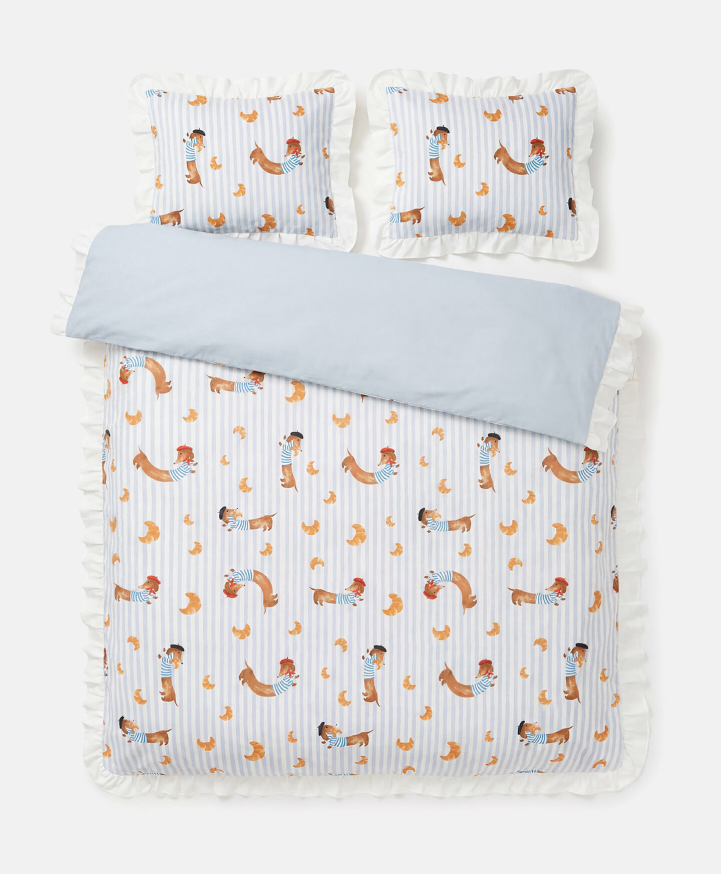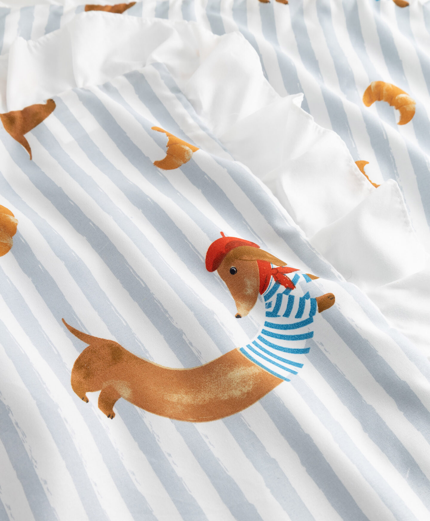Setul de lenjerie de pat cu model teckel este alegerea perfectă pentru cei care își doresc un dormitor stilat. Culoarea albă, combinată cu modelul adorabil de căței purtând berete, adaugă o notă elegantă oricărui decor. Setul include husa de pilotă și două fețe de pernă.