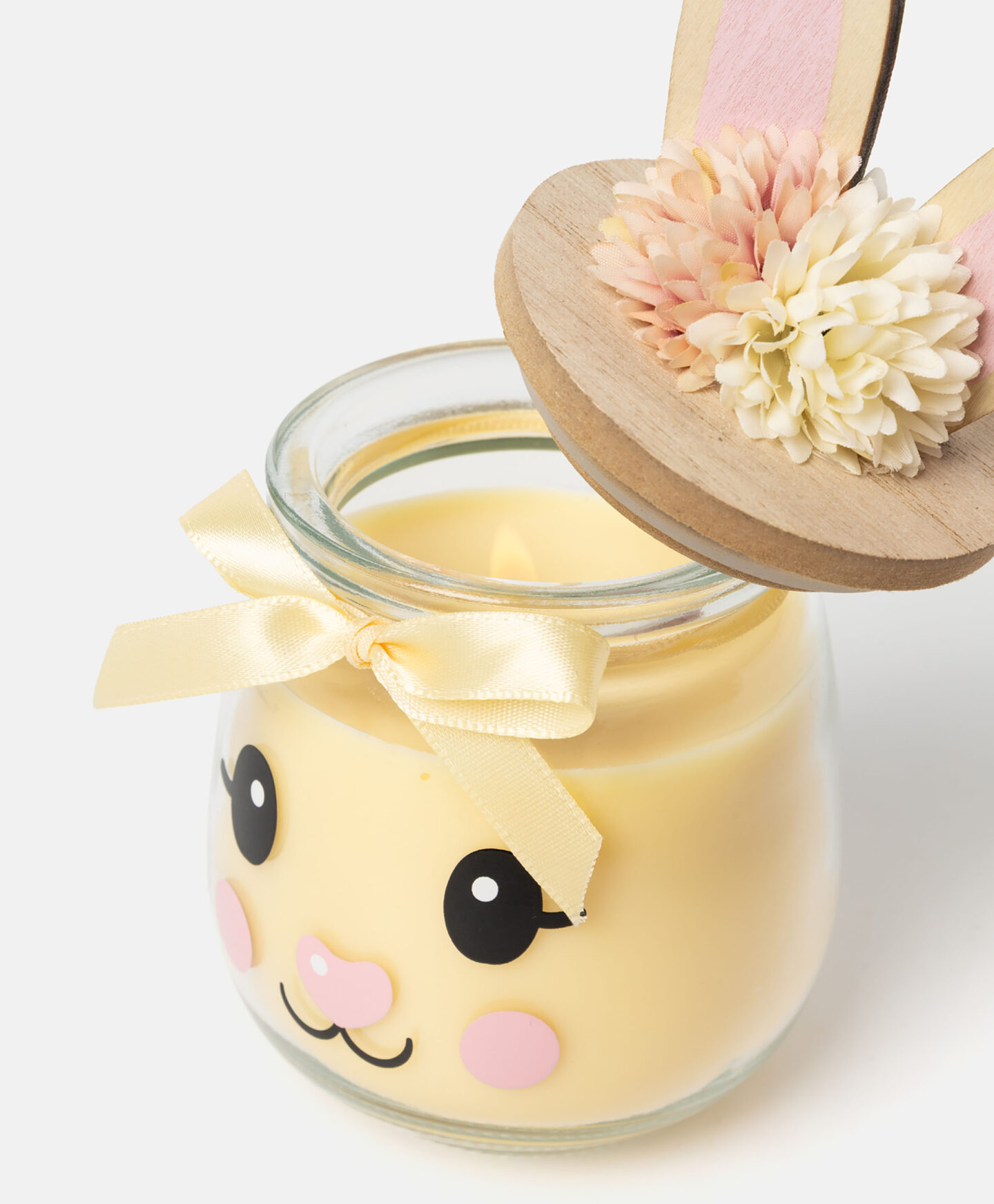Lumânarea parfumată galbenă, în pahar cu capac decorativ cu urechiușe 3D, are un design fermecător inspirat de iepuraș. Oferă timp îndelungat de ardere și parfum plăcut. Sunt disponibile trei modele.