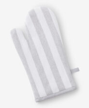 Mănușa de bucătărie cu dungi gri este practică și elegantă. Îți protejează mâinile de arsuri în timp ce gătești sau coci și se integrează frumos ca element decorativ. Sunt disponibile mai multe modele.