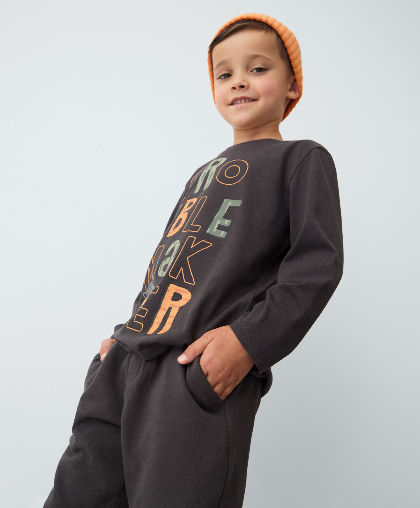 Pantalonii pentru băieți, cu un conținut ridicat de bumbac, sunt un element indispensabil în garderoba de toamnă. Terminați cu manșete elastice, îți oferă căldură și confort. Materialul plăcut pe piele învăluie delicat corpul, asigurând confort la fiecare mișcare. Este disponibilă și o bluză cu mânecă lungă, perfect asortată.