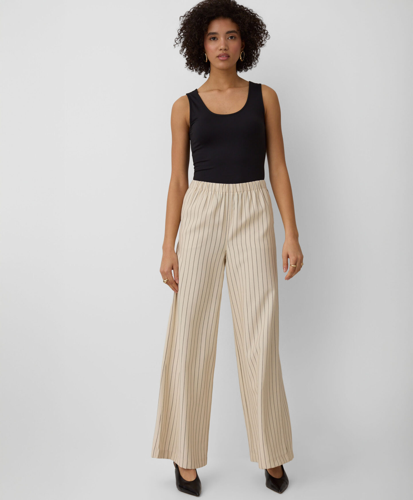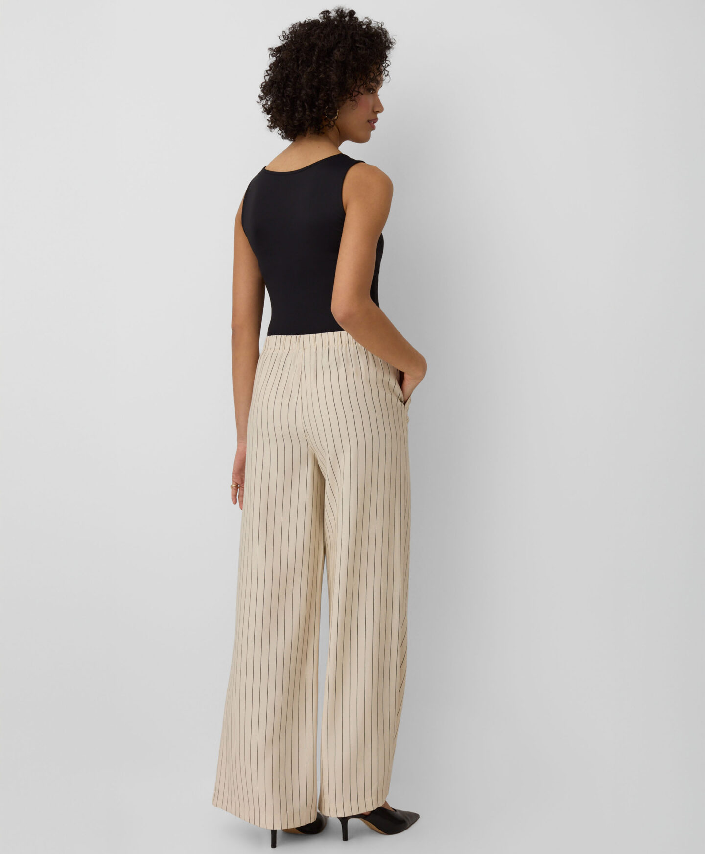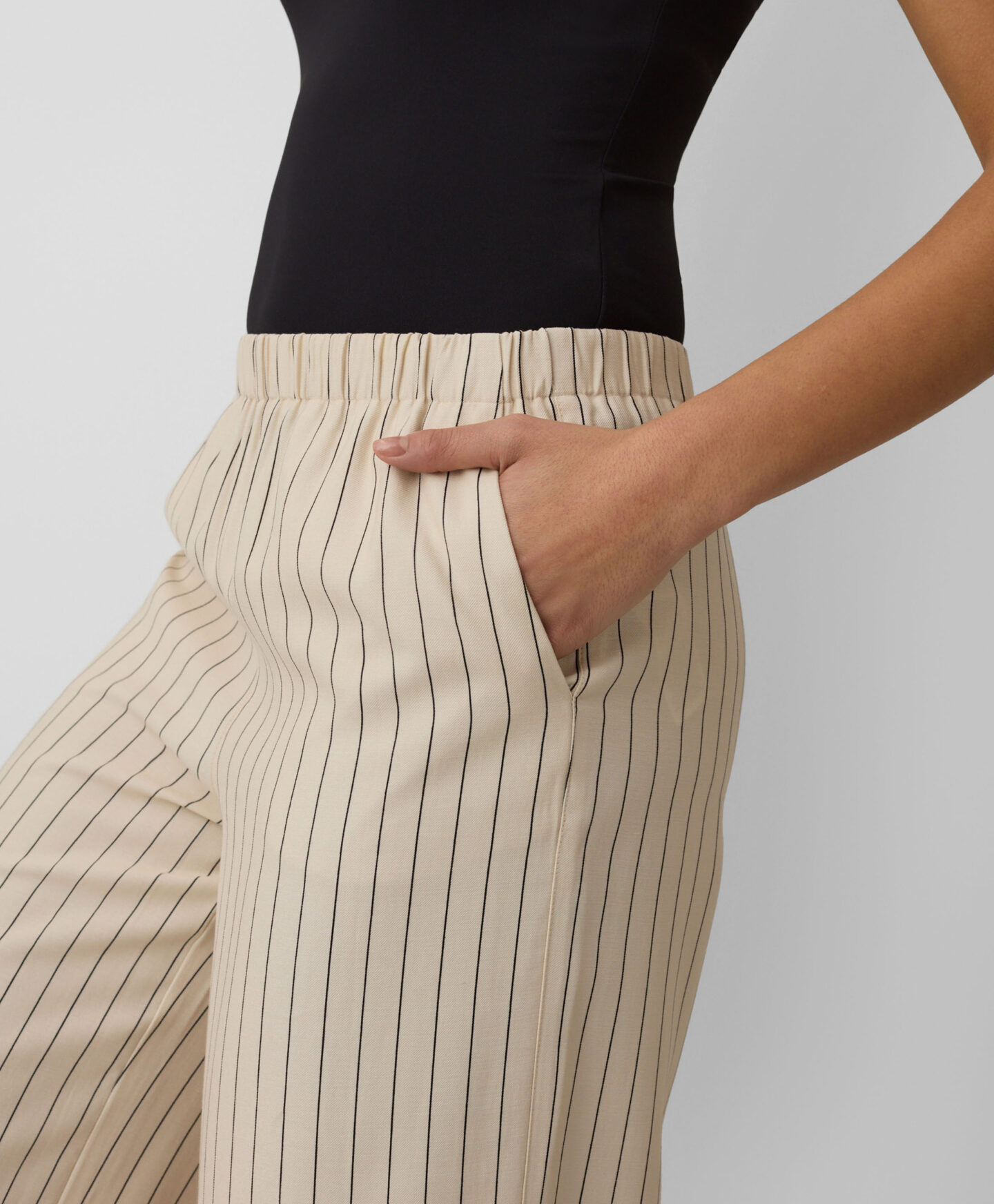 Pantalonii cu dungi pentru femei completează perfect vesta asortată. Sunt ușori, aerisiți și se așază frumos pe corp. Culorile neutre permit combinarea ușoară cu piese uni, de la bluze la cămăși elegante.