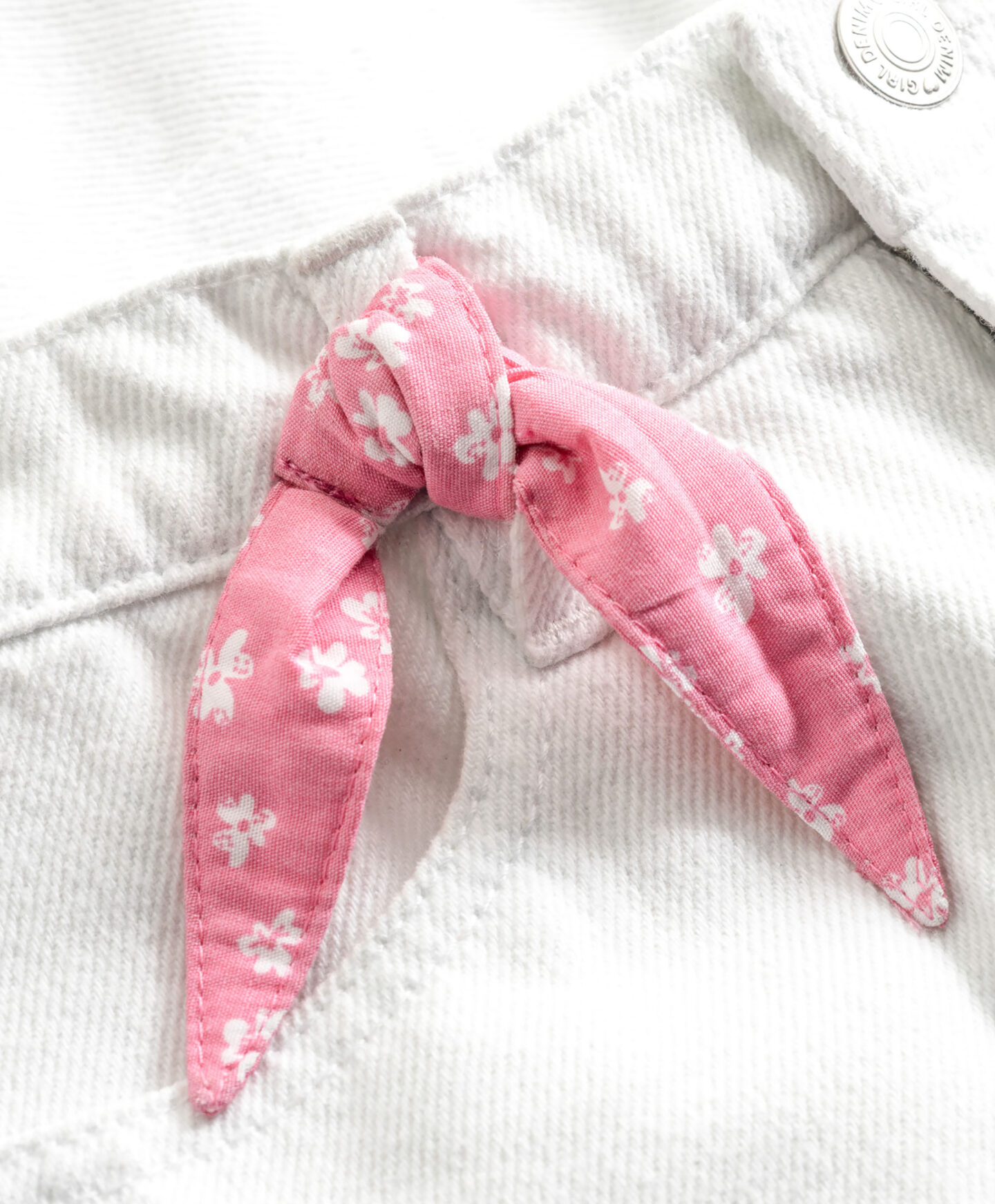 Pantalonii scurți denim pentru fete reprezintă una dintre cele mai moderne alegeri ale verii. Denim-ul alb este un clasic care se potrivește ușor cu alte culori și modele. Croiala universală asigură confort în timpul aventurilor de vară, iar talia cu nasture permite o potrivire perfectă. Eșarfa roz este un accesoriu stilat care poate fi legat în fundă. Se potrivesc perfect cu tricouri în dungi sau cu broderii.