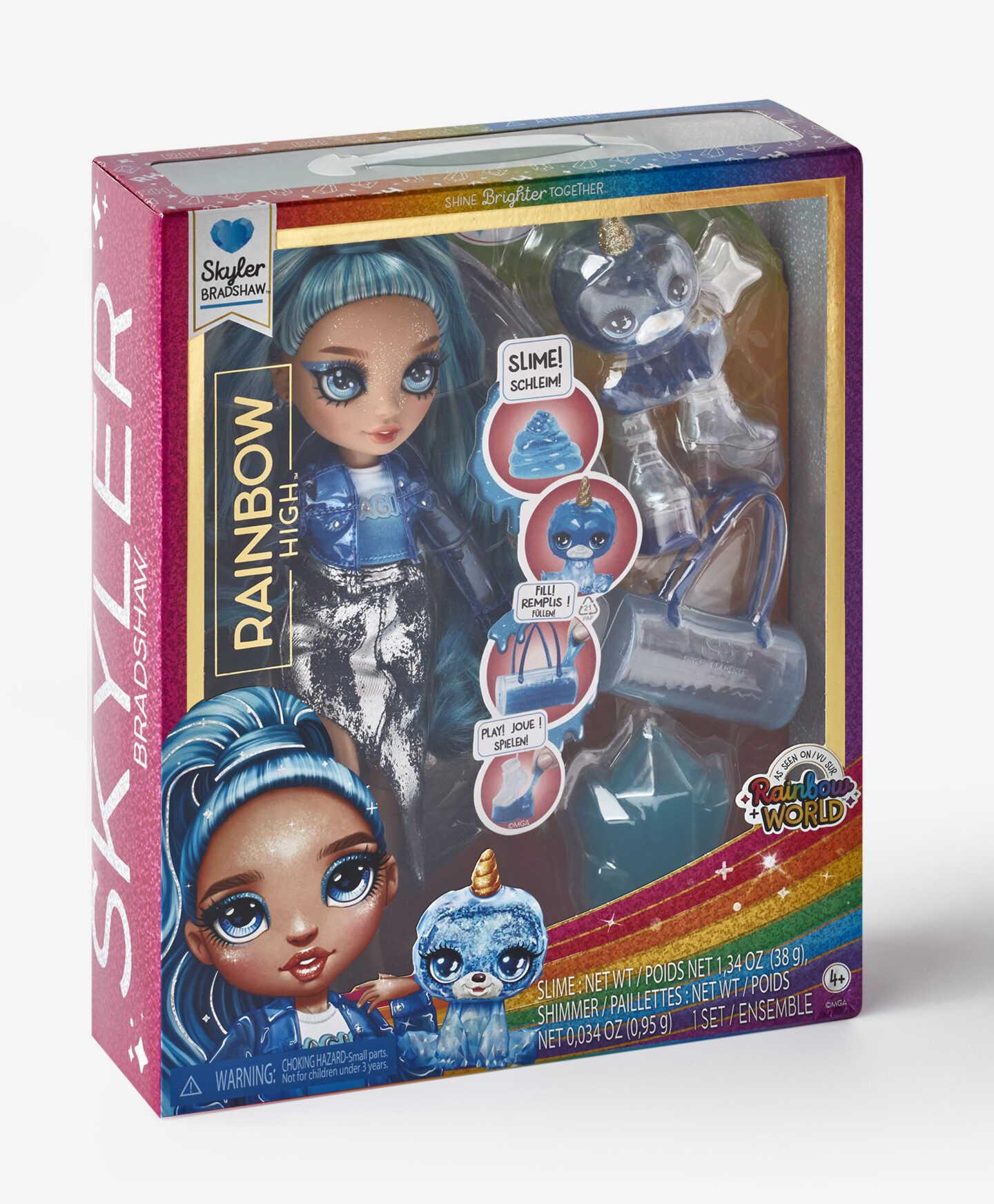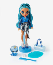 Păpușa Rainbow High Skyler Bradshaw strălucește prin culorile vii și accesoriile care îmbogățesc timpul de joacă. Rochia sclipitoare cu model asimetric se potrivește perfect cu părul lung turcoaz. Setul include o poșetă, un pieptene, un suport și alte accesorii, stimulându-ți imaginația și dorința de a crea scenarii diverse.