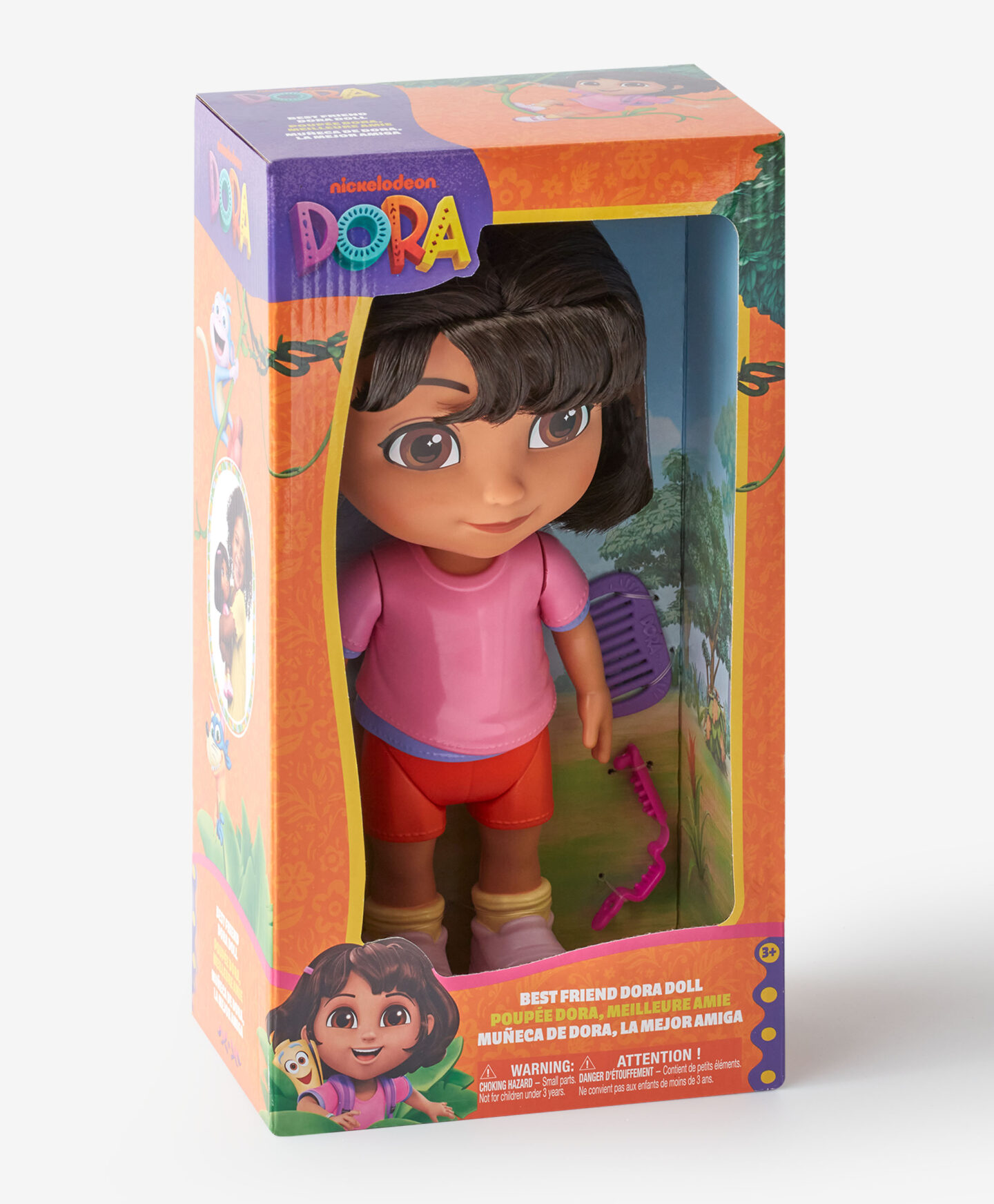 Păpușa te poartă în lumea aventurilor alături de personajul emblematic Dora. Cu tricoul roz și pantalonii portocalii, arată exact ca în desenul animat preferat, devenind imediat recunoscută de copii. Detaliile realiste și zâmbetul ei cald fac joaca și mai plină de imaginație și bucurie.