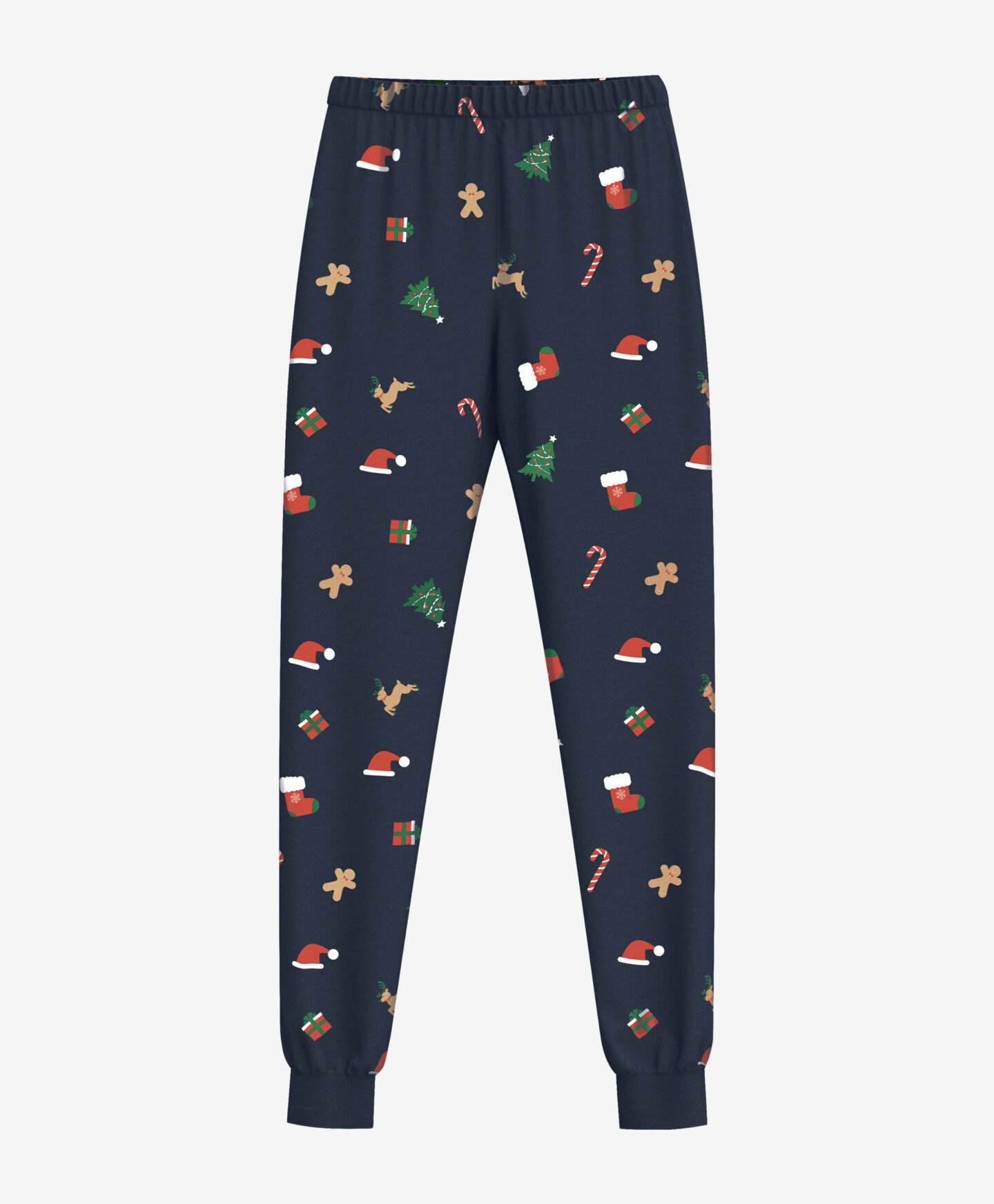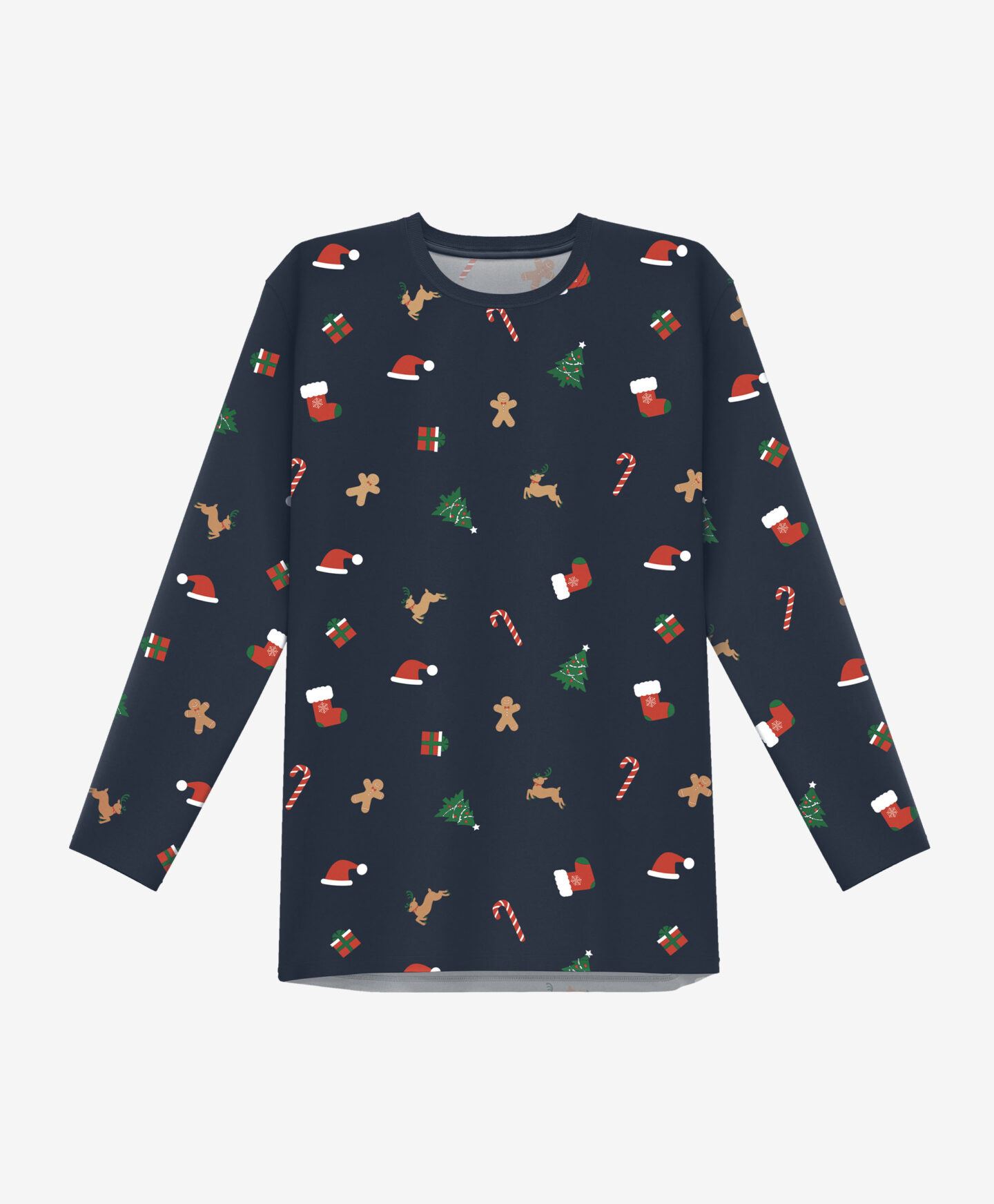 Pijamaua pentru bărbați cu tematică de Crăciun este formată dintr-o bluză cu mânecă lungă și pantaloni. Nuanța bleumarin este completată de un imprimeu festiv cu cadouri, brazi, turtă dulce și bastonașe. Este un cadou emblematic de Crăciun sau de Moș Nicolae, perfect pentru iubitorii atmosferei dulci de sărbători.
