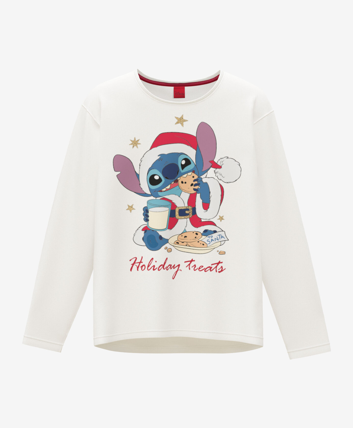 Pijamaua pentru damă cu licență Lilo & Stitch este alcătuită dintr-un tricou din bumbac cu mâneci lungi și pantaloni scurți din flanel. Tema de Crăciun inspirată din animația emblematică îți va cuceri inima dacă ești fan Disney. Pijamaua este moale, plăcută la atingere și călduroasă, fiind perfectă pentru nopțile reci de iarnă. Este și o idee excelentă de cadou.
