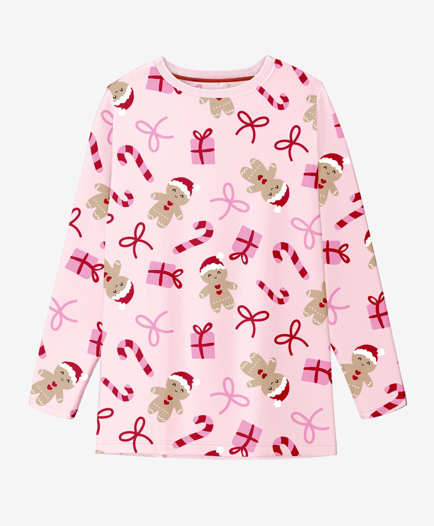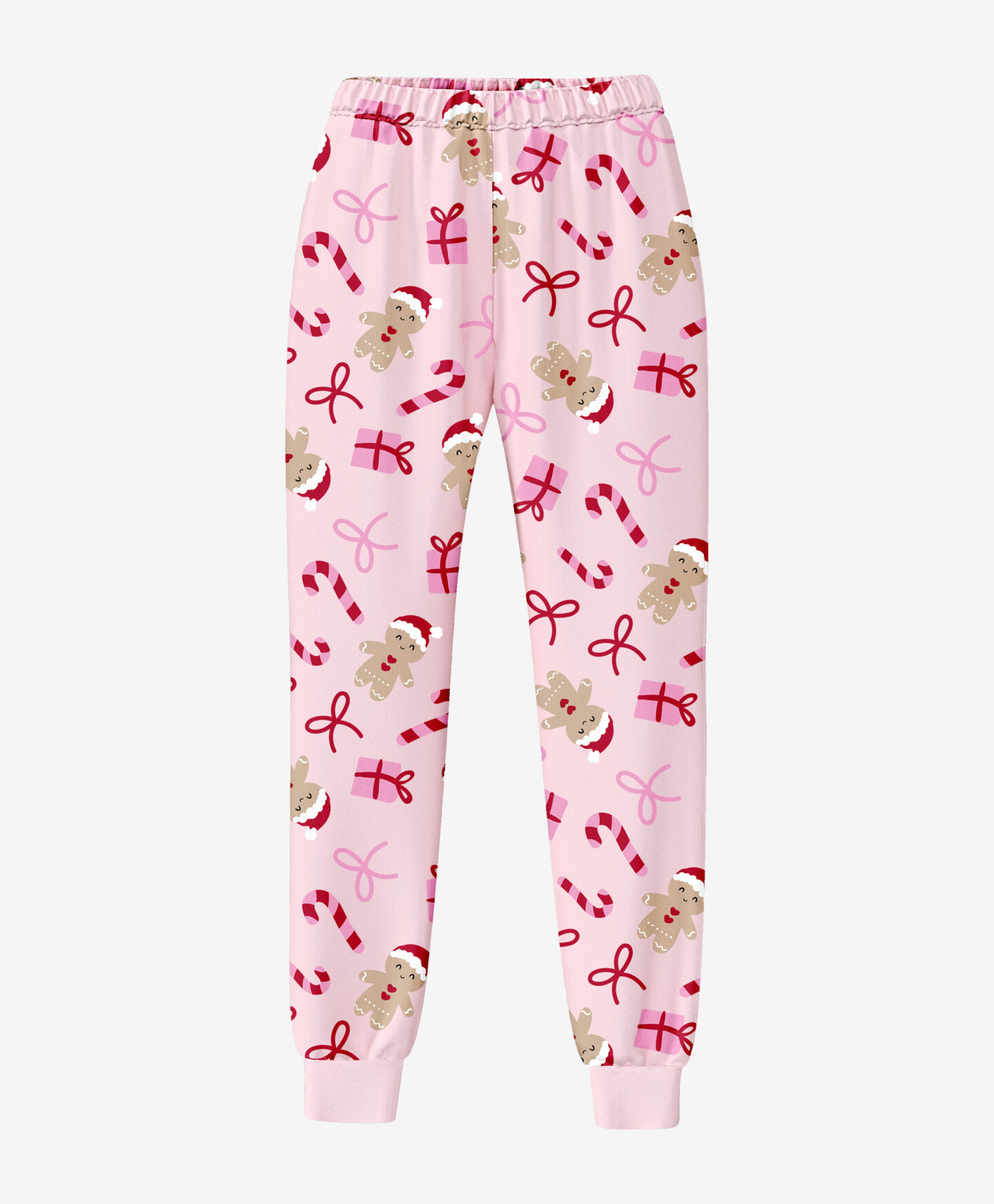 Pijamaua pentru femei din catifea cu imprimeu festiv de turtă dulce, cadouri și fundițe este o idee de cadou emblematică. Setul este compus dintr-o bluză cu mânecă lungă și pantaloni confecționați din catifea moale și călduroasă, perfectă pentru nopțile de iarnă.
