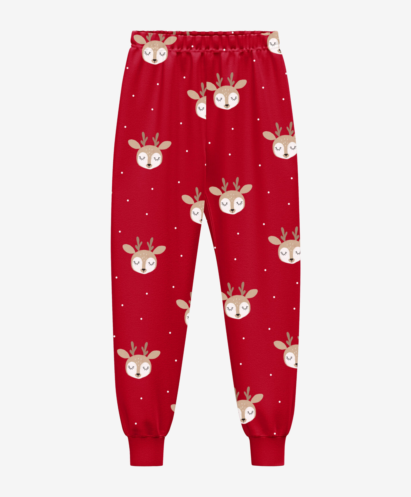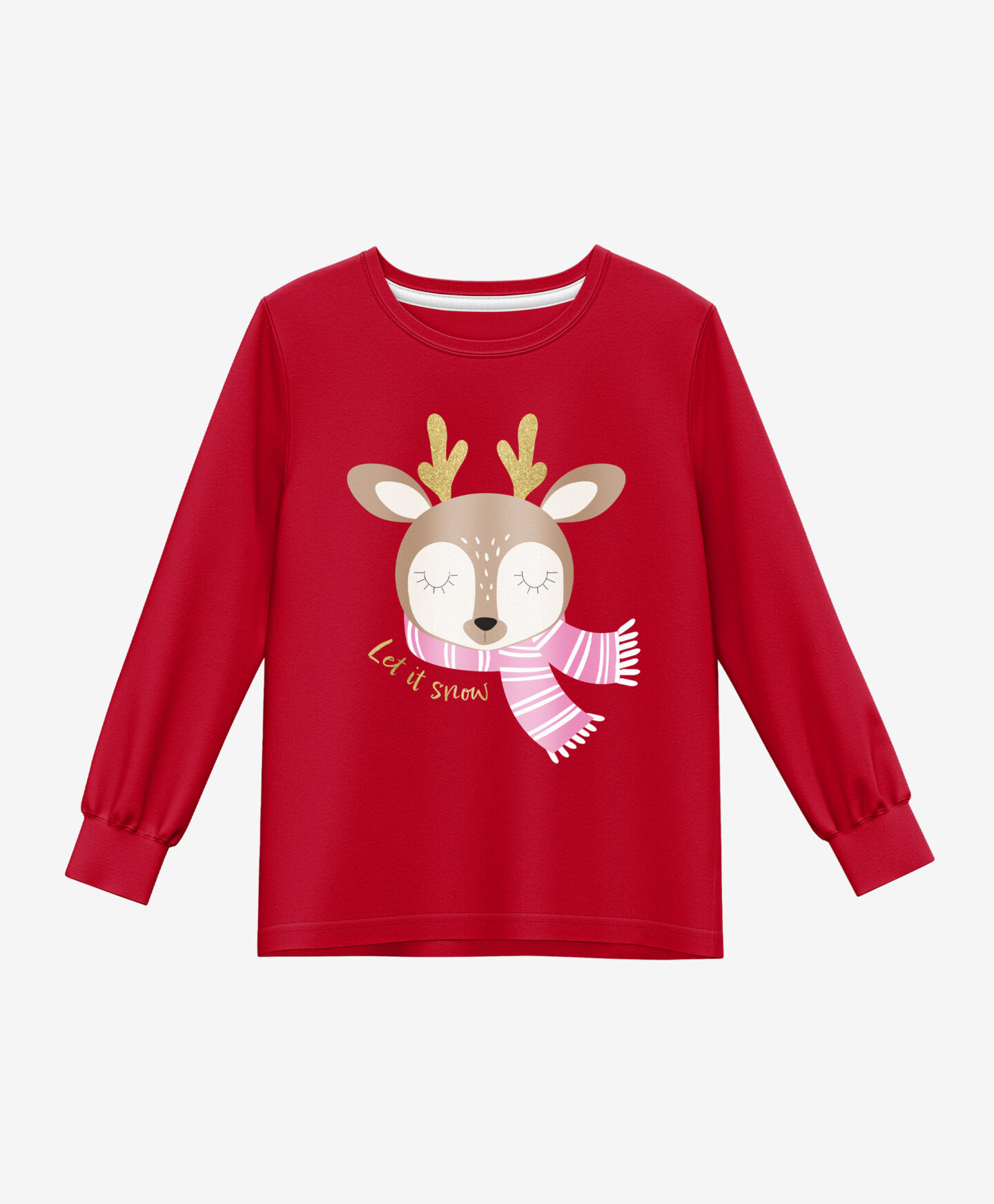 Pijamaua pentru fete cu reni, din bumbac 100%, este o alegere încântătoare pentru nopțile de iarnă. Setul este format dintr-o bluză cu mânecă lungă și pantaloni care oferă căldură și confort. Bumbacul moale îmbrățișează delicat pielea, iar imprimeul cu ren adaugă un strop de magie de sărbătoare.