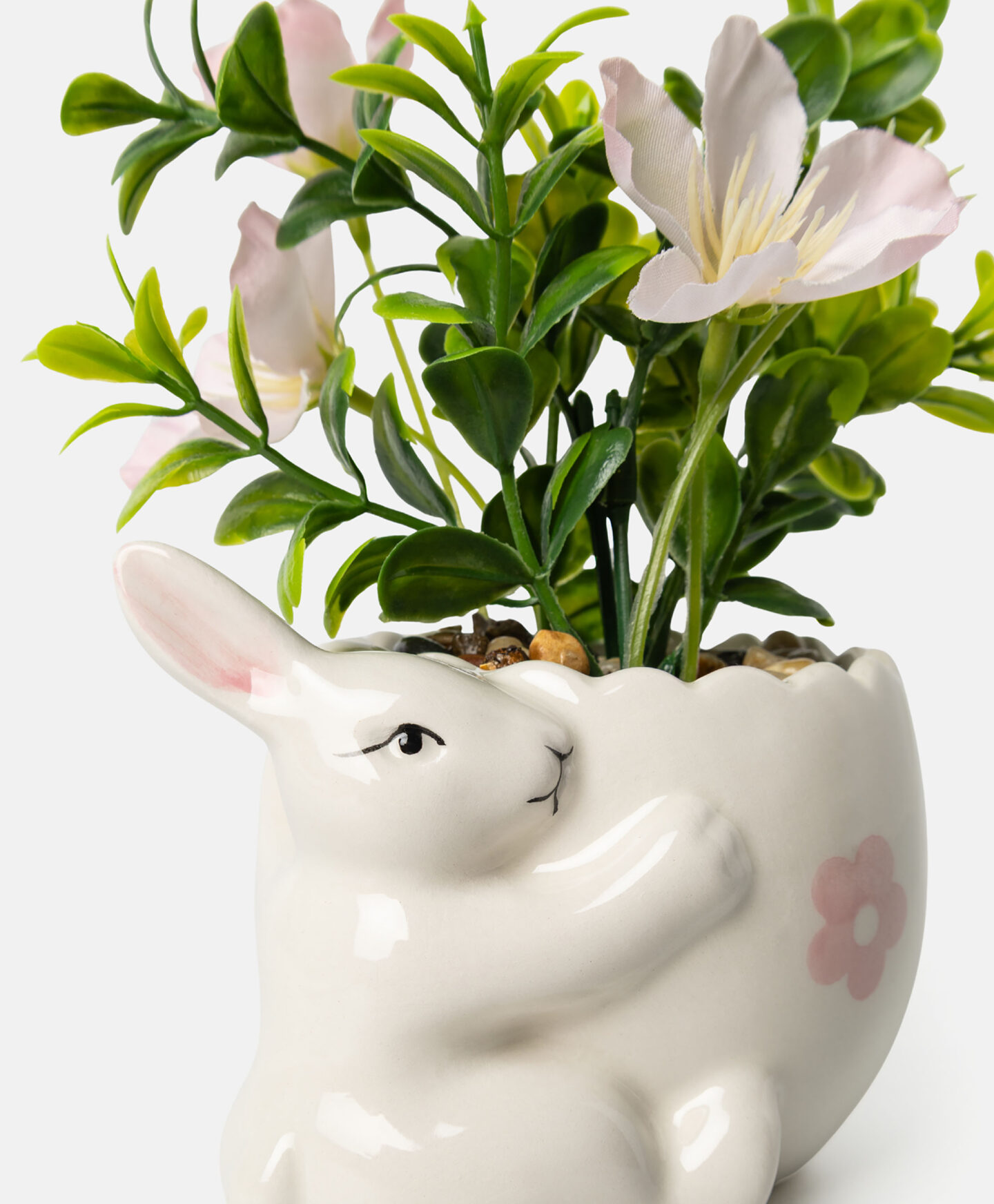 Planta artificială în ghiveci decorativ cu iepuraș 3D este un accesoriu estetic pentru orice interior. Aduce un aer de primăvară și își păstrează verdele intens fără a necesita îngrijire sau udare.