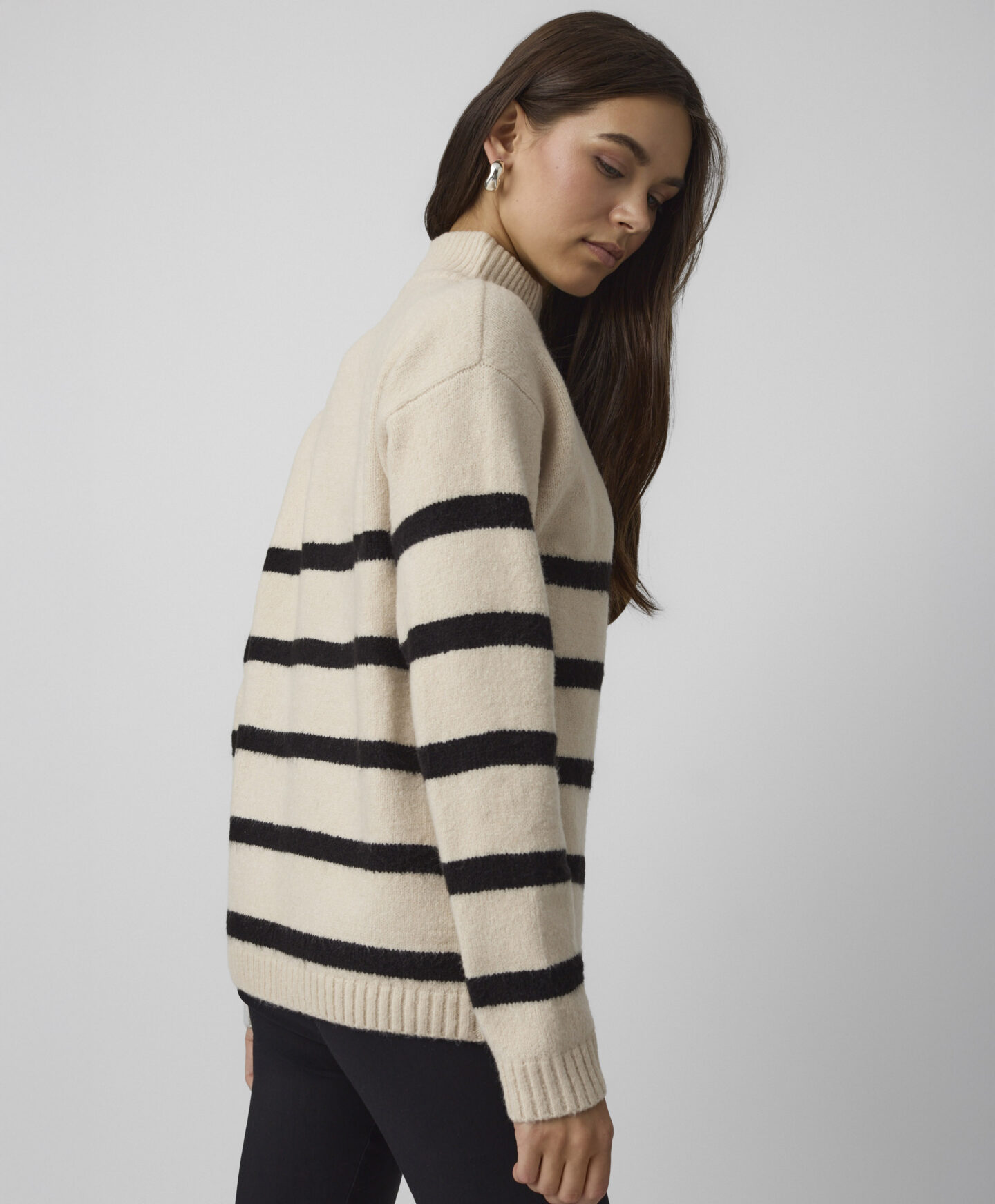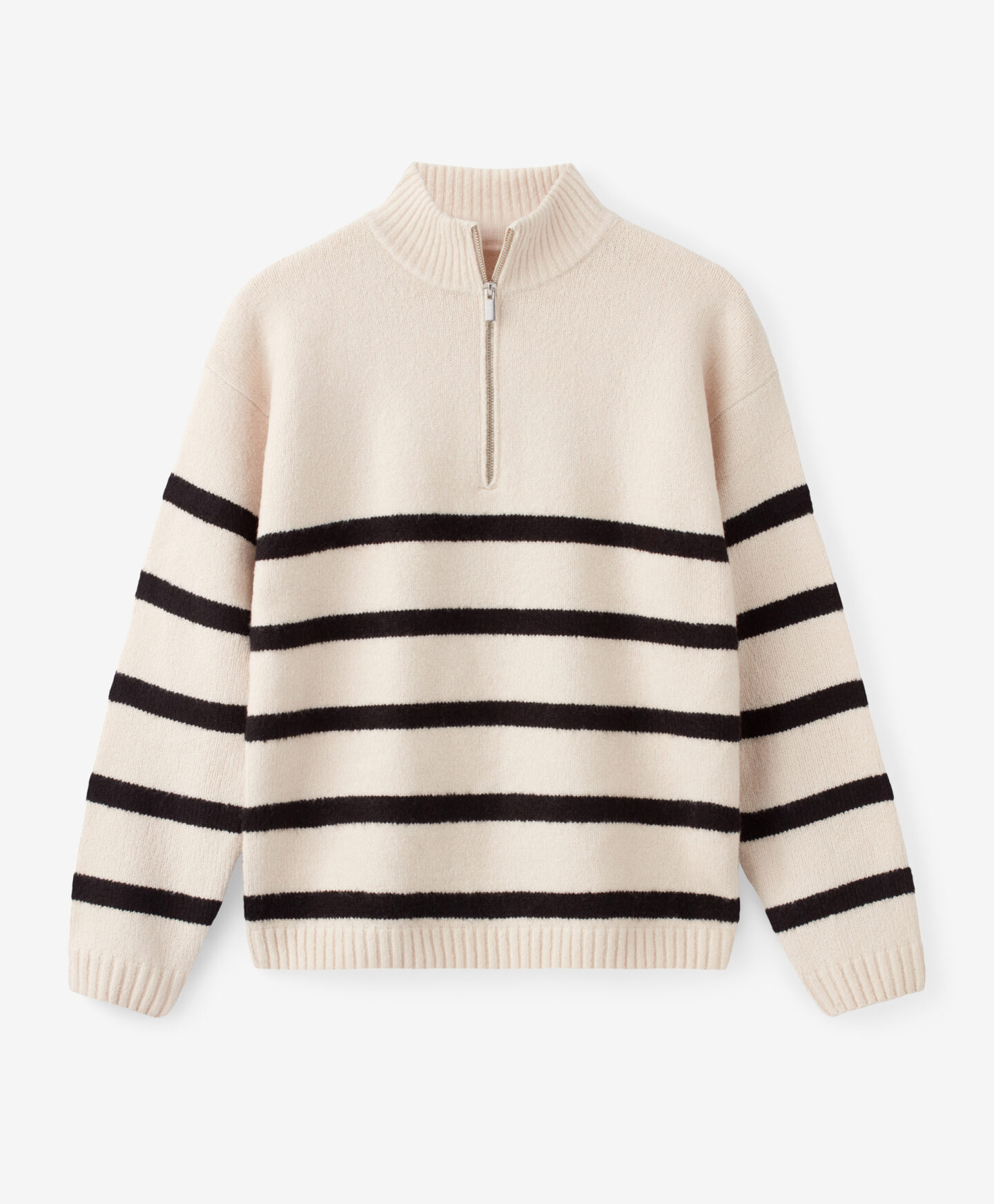 Puloverul cu dungi pentru femei, închis cu fermoar la gât, este alegerea perfectă dacă apreciezi stilul clasic cu un twist modern. Este călduros și moale la atingere – ideal pentru primele zile răcoroase de toamnă. Modelul cu dungi, atemporal, adaugă eleganță oricărei ținute și nu se demodează niciodată.