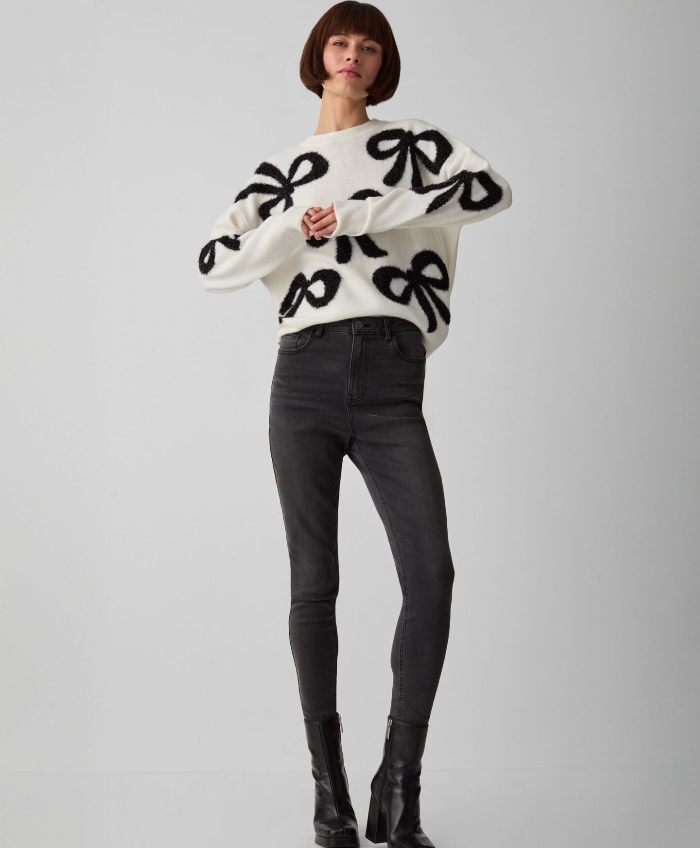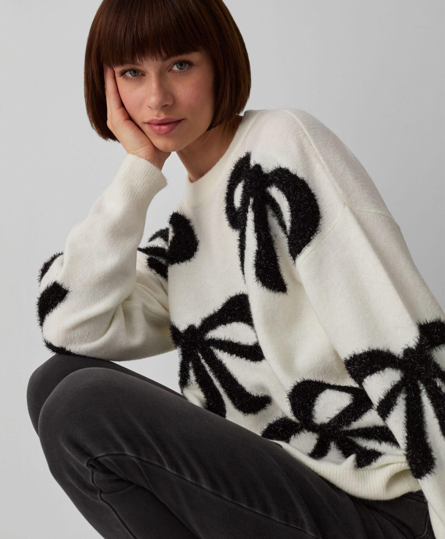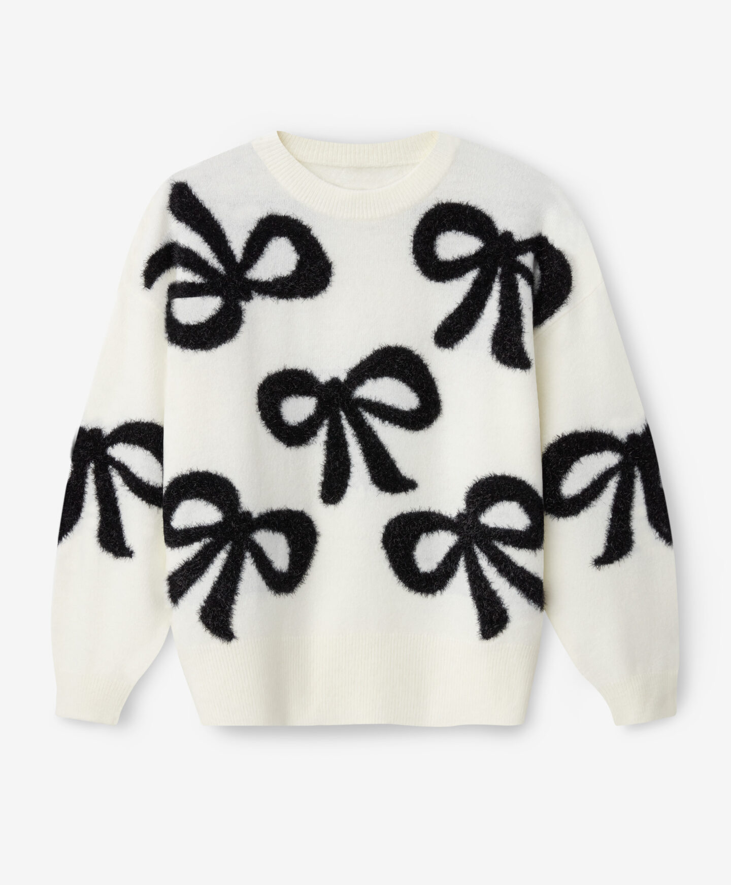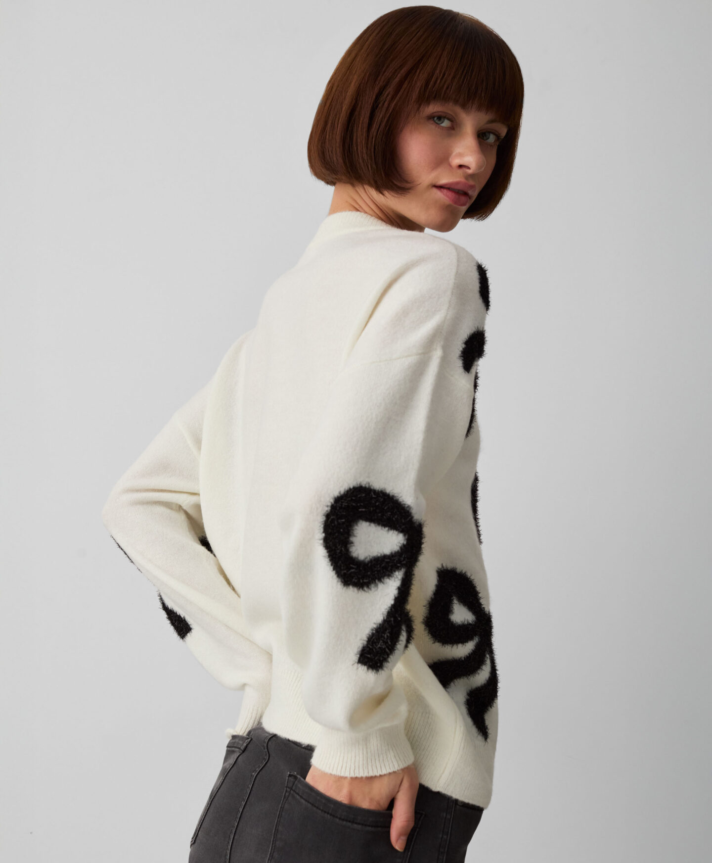 Puloverul pentru femei cu fundă și lurex este pentru cele care adoră să strălucească. Combinația de culori clasice, alb și negru, completează perfect garderoba de toamnă și oferă multe opțiuni de stil. Este călduros, moale la atingere și arată minunat pe siluetă.