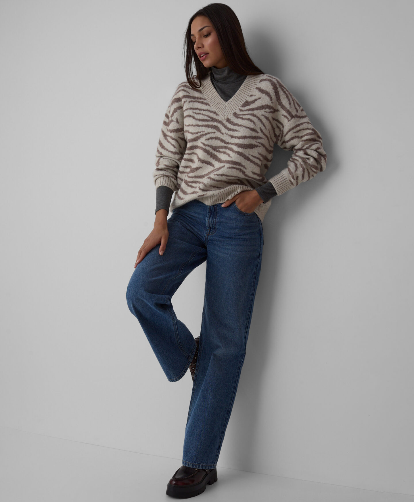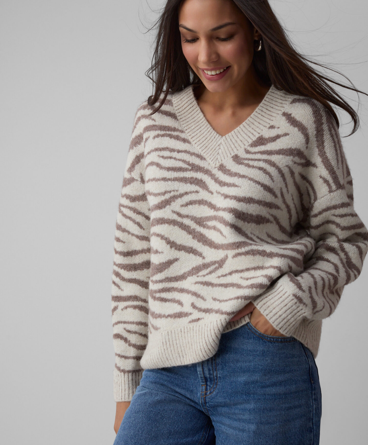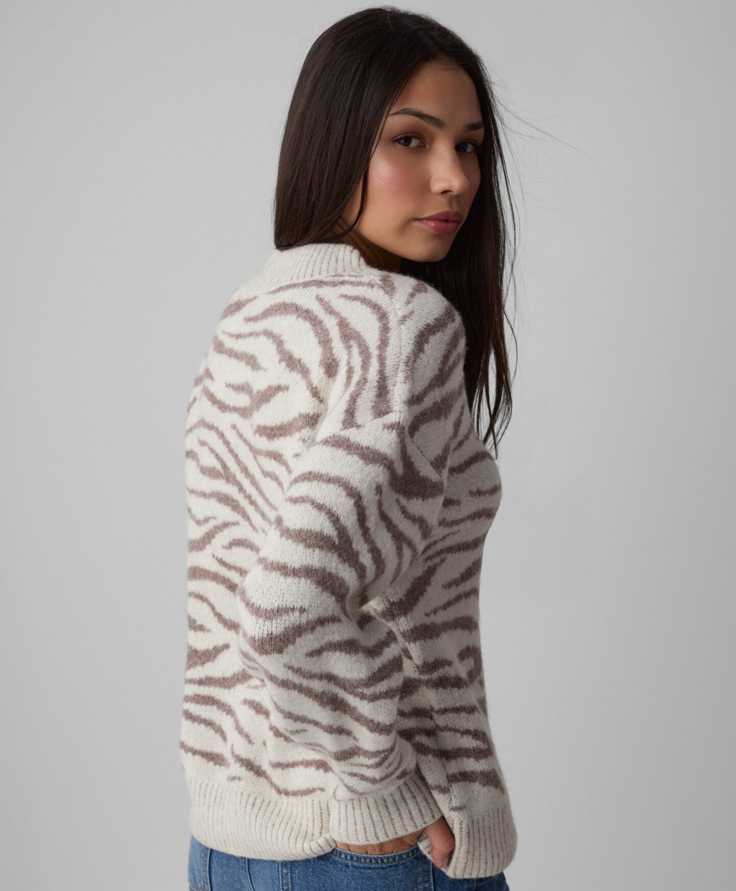 Puloverul pentru femei cu imprimeu zebră este ideal pentru femeile care doresc să iasă în evidență. Este călduros și potrivit pentru sezonul rece. Poate fi purtat singur sau combinat cu alte piese vestimentare clasice.