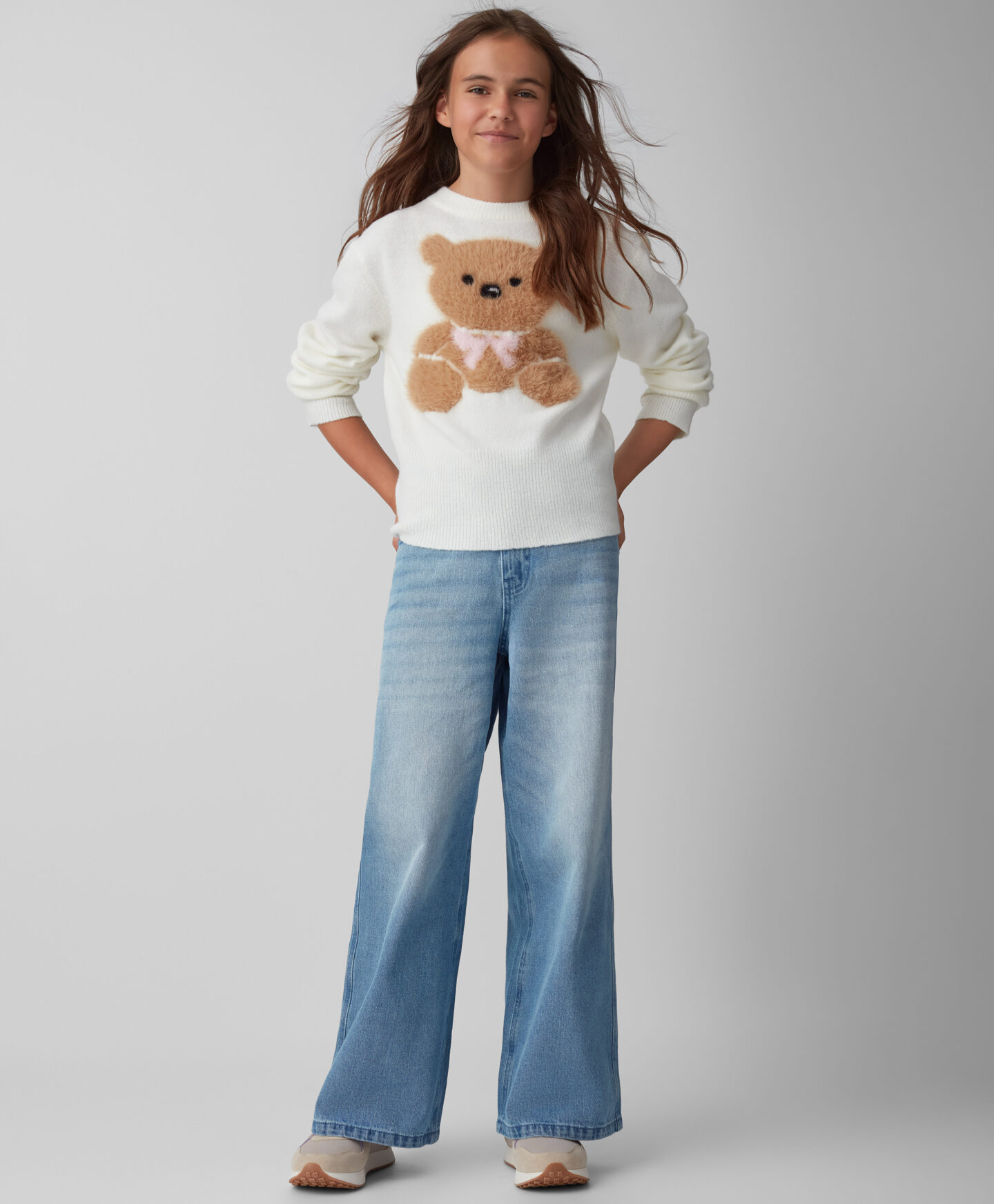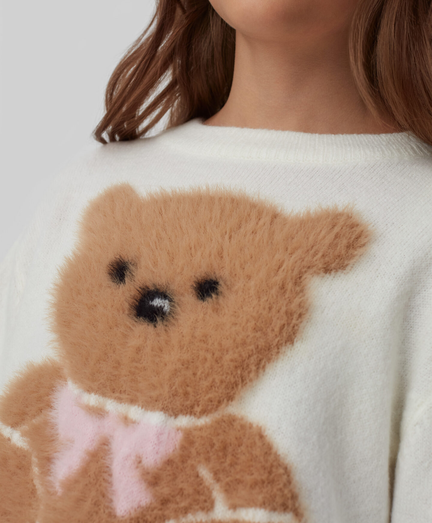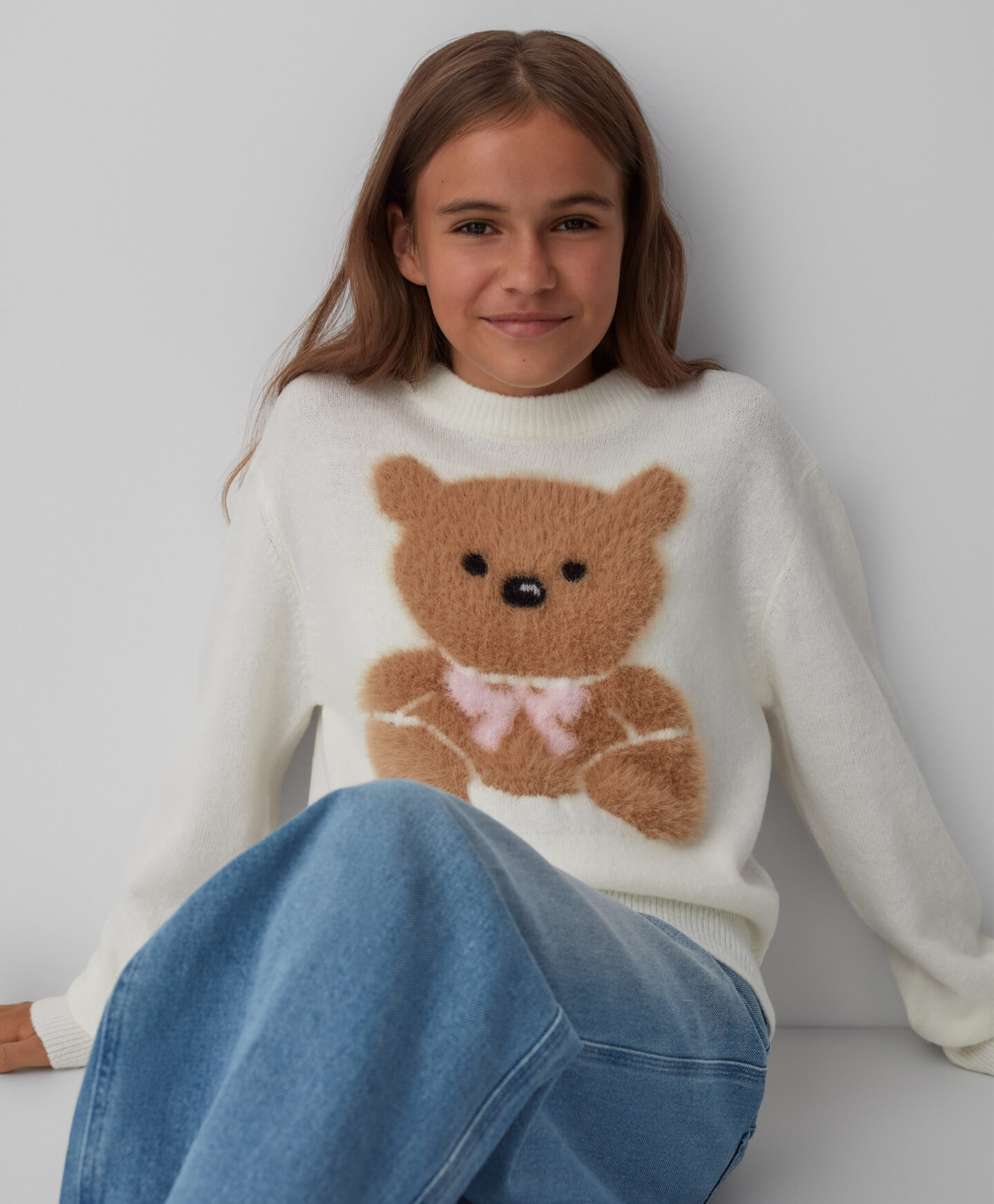 Puloverul crem pentru fete este un adevărat succes în acest sezon de toamnă/iarnă! Designul adorabil cu un ursuleț pe față va fi un accent fermecător pentru orice ținută. Se potrivește perfect cu jeanși, colanți sau o fustă, fiind alegerea ideală pentru ținutele de zi cu zi la școală.