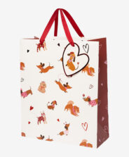 Punga cadou cu motiv de cățeluși și etichetă în formă de inimă oferă un mod adorabil de a ambala cadouri într-un stil unic, fiind potrivită pentru orice ocazie și ideală pentru iubitorii de animale; include o etichetă pentru personalizarea mesajului.