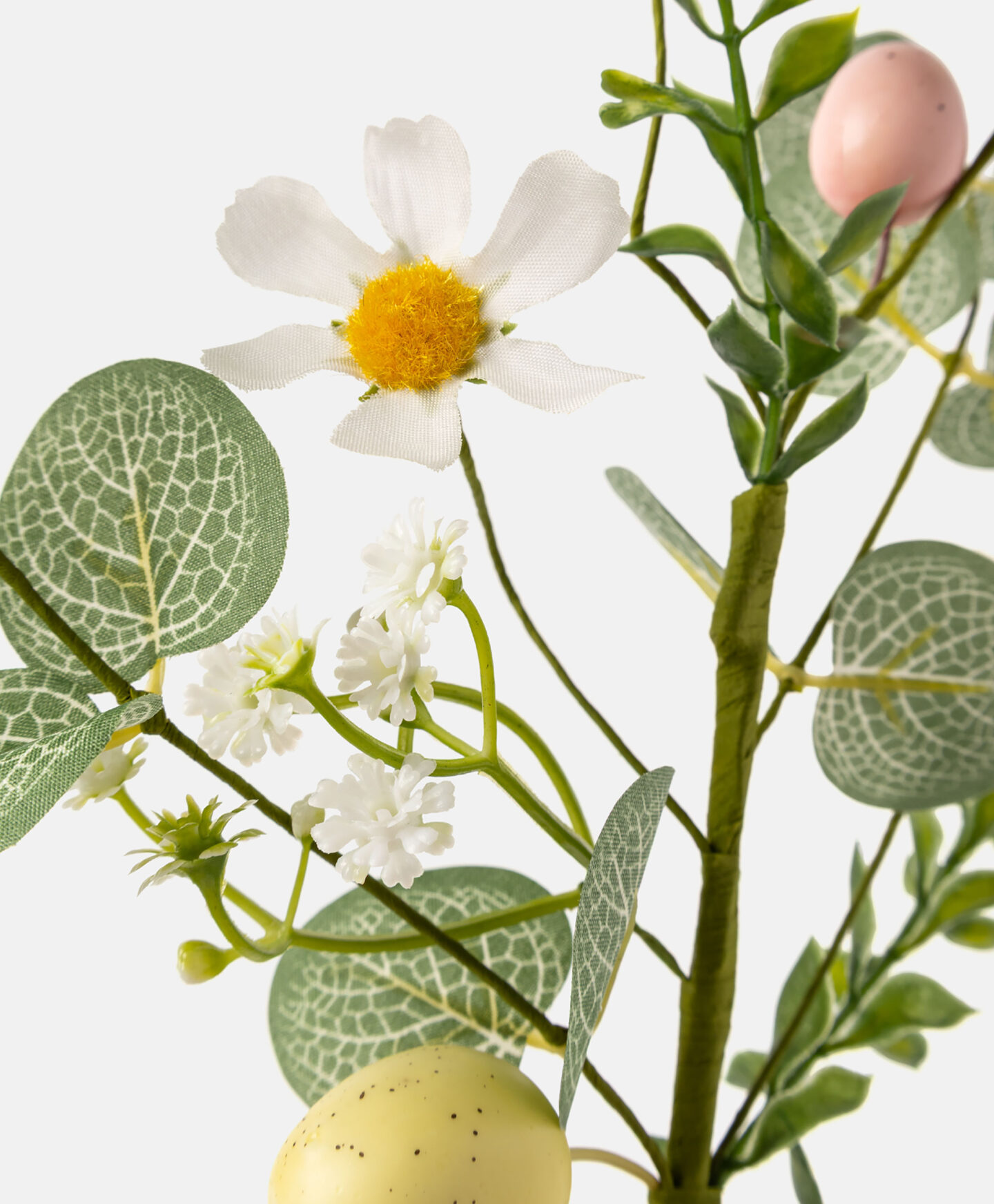 Crenguța decorativă cu ouă de Paște colorate și flori este soluția perfectă dacă îți dorești o decorațiune gata făcută, spectaculoasă. O poți folosi pentru a crea un aranjament mai amplu sau o poți fixa într-un ghiveci, pentru a oferi florilor crescute acasă un accent pascal. Se potrivește și într-un buchet sau expusă singură într-o vază. Va aduce primăvara în livingul tău.