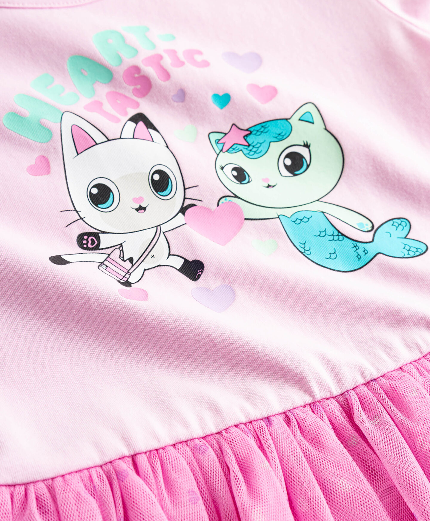 Rochia pentru fete cu licență Gabby’s Dollhouse are partea de jos din tul, care îi oferă lejeritate și un aspect de poveste. Imprimeul cu personajele preferate din față atrage atenția și scoate rochia în evidență față de alte articole vestimentare. Este o alegere ideală pentru grădiniță sau evenimente în familie.