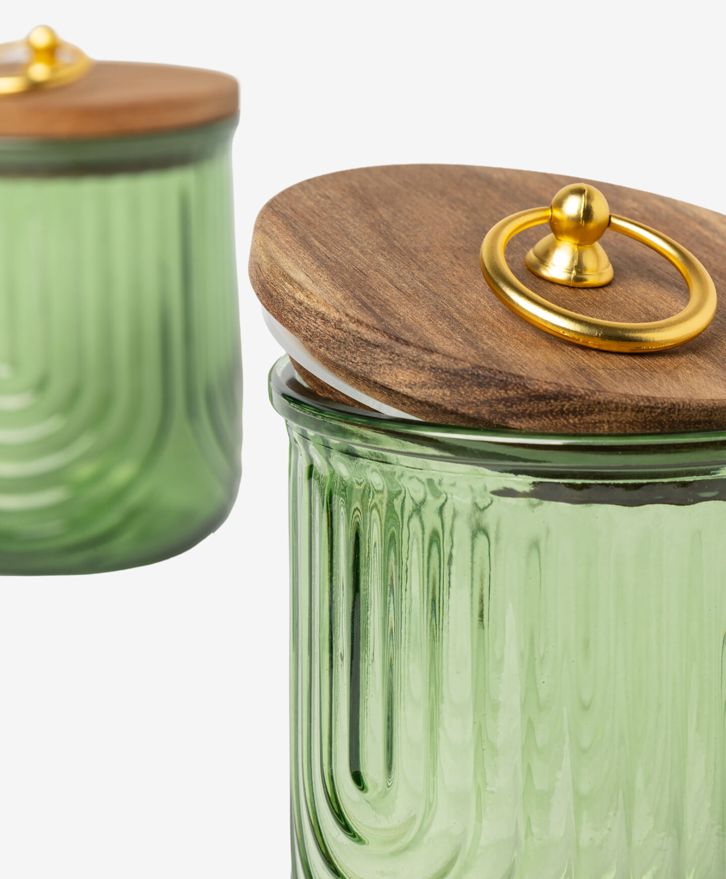 Setul de 2 borcane combină utilitatea cu un design elegant. Realizate din sticlă decorativă, sunt ideale pentru depozitare în bucătărie sau baie, iar capacul din lemn adaugă un aspect natural și ajută la păstrarea prospețimii conținutului.