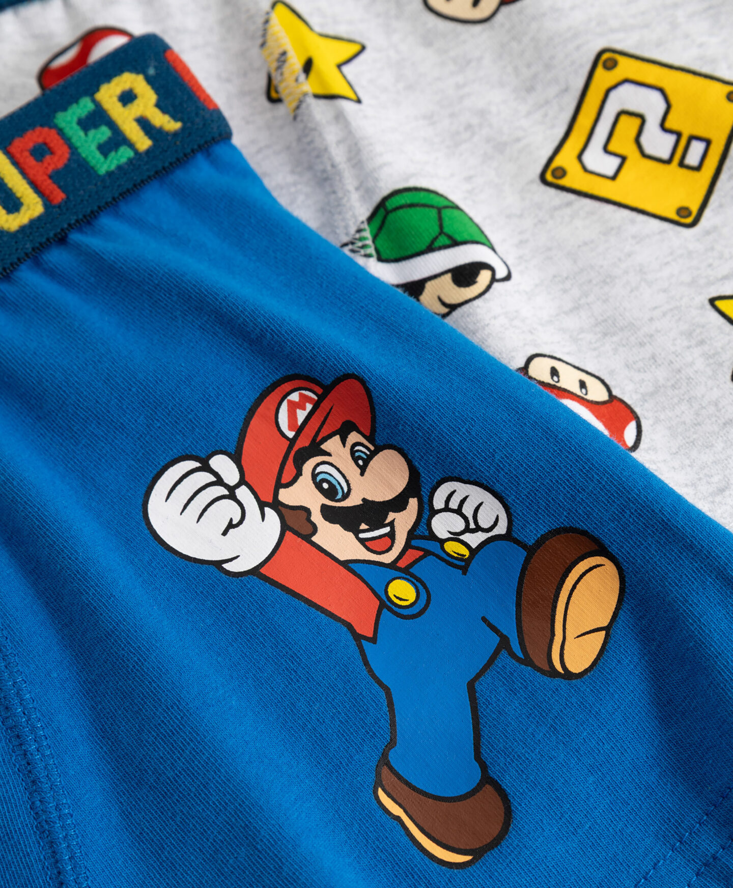 Setul de 2 perechi de boxeri pentru băieți cu licență Super Mario, cu conținut ridicat de bumbac, îmbină confortul cu un design atractiv. Fiecare pereche se remarcă printr-un model diferit cu personajul iconic din jocurile Nintendo și prin inscripția colorată de pe banda elastică. Boxerii sunt confortabili și oferă libertate deplină de mișcare.
