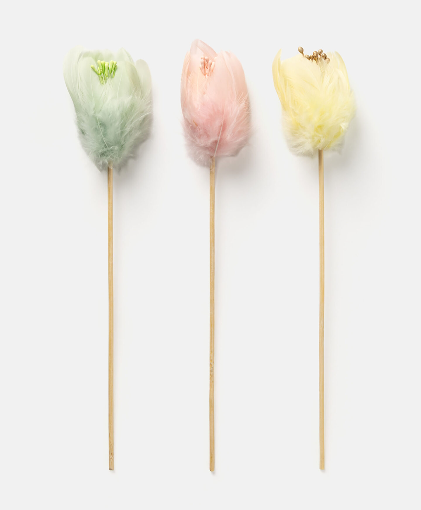 Setul de 3 decorațiuni tip pick cu flori și pene adaugă farmec și un aer pascal oricărui aranjament floral, decorațiuni sau compoziții de masă. Le poți pune și în coșul de Paște sau într-o plantă la ghiveci. Culorile pastel atrag privirea, iar penele adaugă un plus de lejeritate.