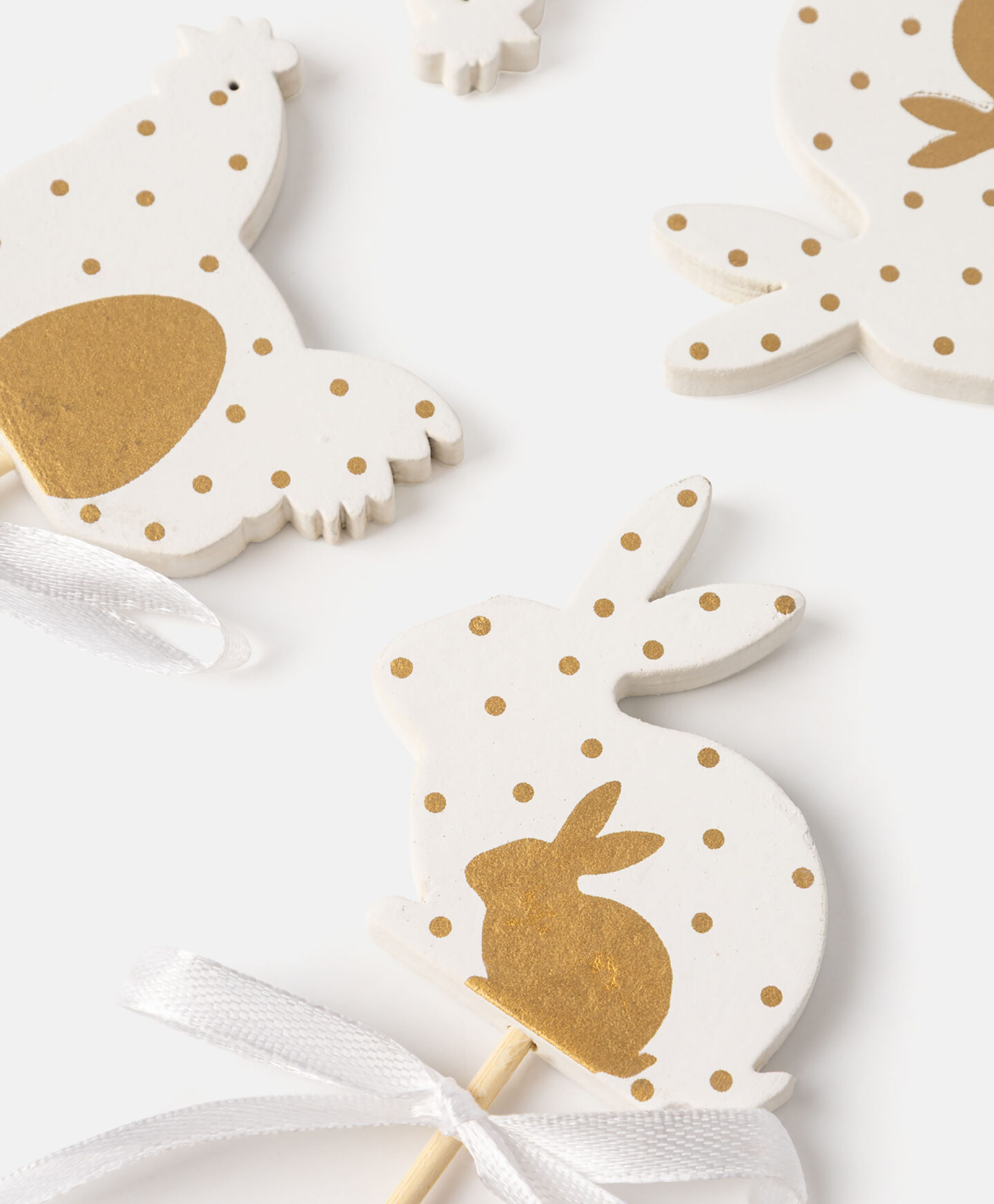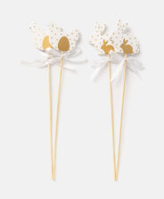 Setul de 4 decorațiuni tip pick cu găinușe și iepurași cu fundițe este un ornament elegant inspirat de simbolurile Paștelui. Este perfect pentru decorarea coșurilor, a plantelor la ghiveci sau a buchetelor. Sunt disponibile diverse modele.