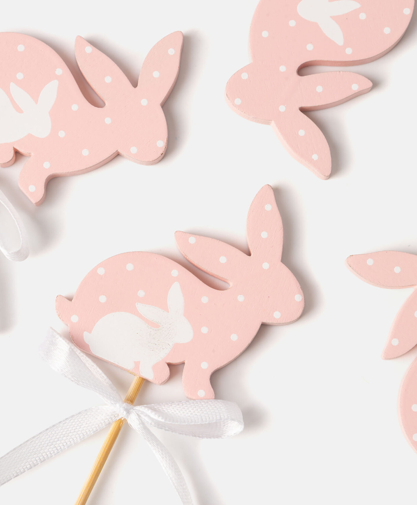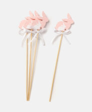 Setul de 4 decorațiuni tip pick cu iepurași și fundițe este un ornament elegant inspirat de simbolurile Paștelui. Este perfect pentru decorarea coșurilor, a plantelor la ghiveci sau a buchetelor. Sunt disponibile diverse modele.