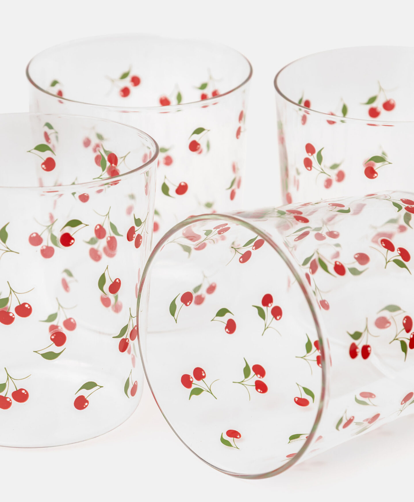 Setul de 4 pahare, cu model de cireșe, va aduce vara în bucătăria ta. Sticla borosilicată este durabilă, rezistentă atât la temperaturi ridicate, cât și la temperaturi scăzute, și ușor de curățat. Aceste pahare sunt perfecte pentru servirea băuturilor preferate. Modelul fructat va adăuga culoare momentelor petrecute împreună.