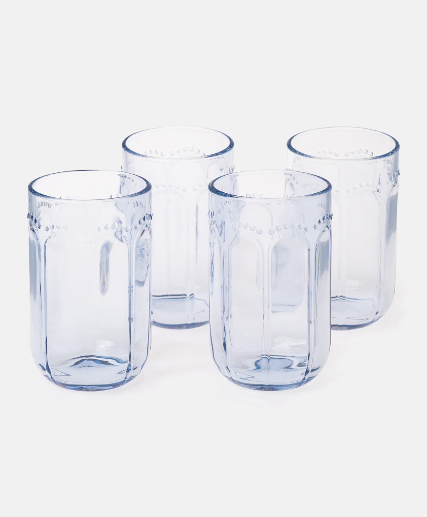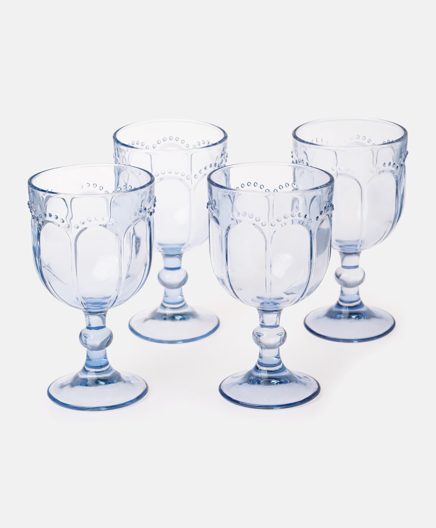 Setul de 4 pahare pentru vin cu relief reflectă frumos lumina. Cupe elegante, perfecte pentru ocazii speciale.