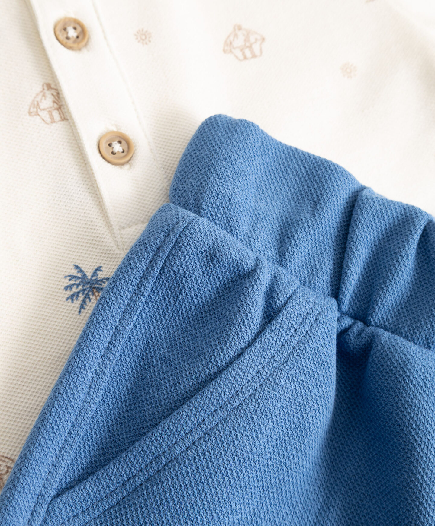 Setul pentru băieți bebeluși combină eleganța unui mic gentleman cu confortul de zi cu zi. Setul include pantaloni scurți comozi și un tricou polo. Elasticul moale se adaptează la burtică fără să o strângă și menține pantalonii la locul lor chiar și în timpul mișcărilor intense din picioare. Zona dintre picioare este gândită astfel încât să ofere suficient spațiu pentru scutec. Setul include și un tricou polo cu nasturi practici sub gât, care îl fac ușor de îmbrăcat. Gulerul moale nu irită pielea sensibilă a copilului. Imprimeul simpatic merită, de asemenea, remarcat, deoarece adaugă farmec întregii ținute.