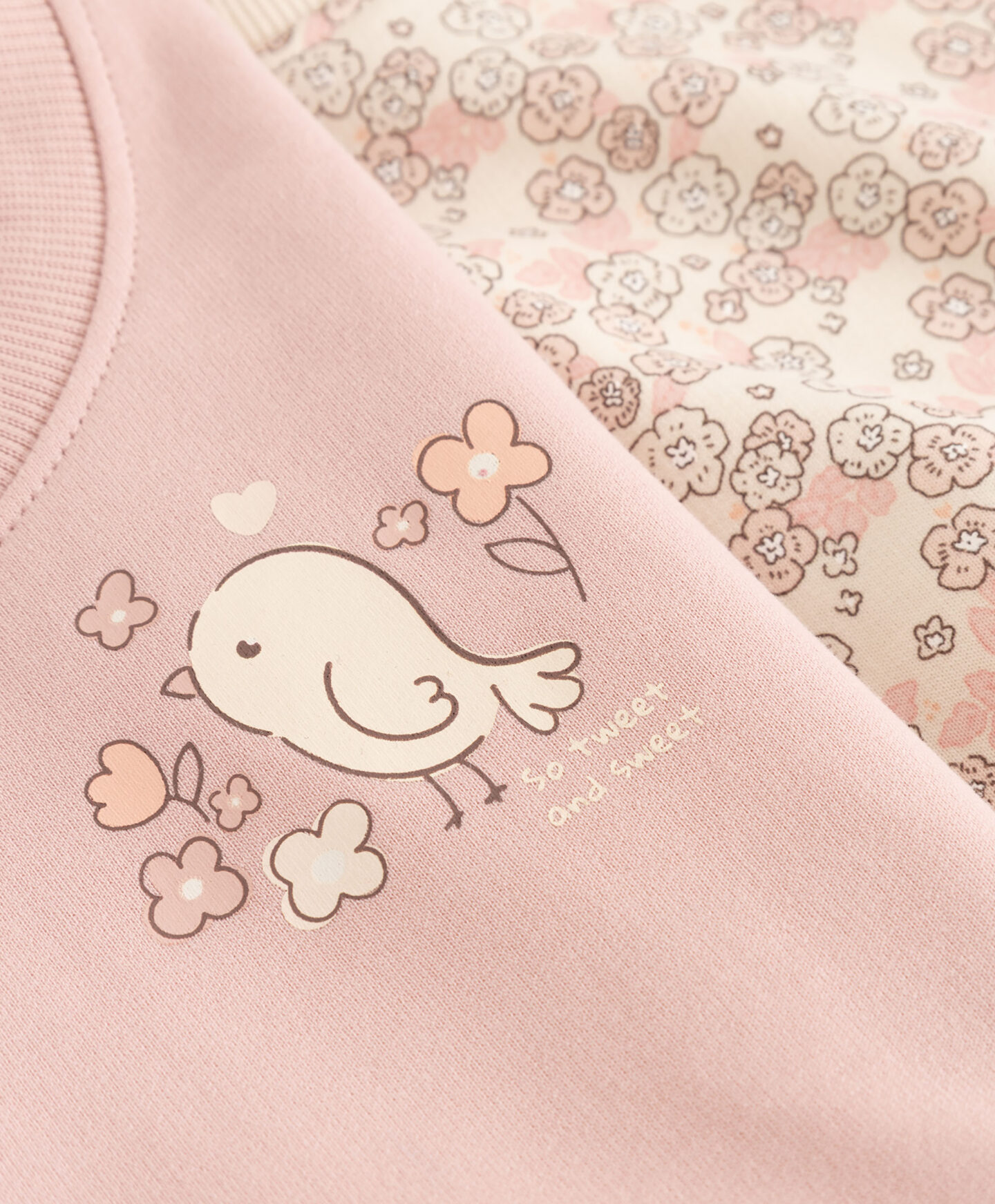 Setul de 2 bluze de trening pentru bebeluși fete din bumbac 100% se va remarca în garderoba copilului. Fiecare piesă are un design de primăvară diferit. Bluzele sunt moi, călduroase și ideale pentru ținute stratificate. Materialul natural este delicat cu pielea și respirabil, asigurând confort zi de zi. Pantalonii asortați sunt disponibili în ofertă.