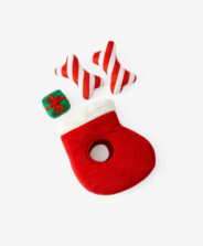 Setul cadou pentru animale roșu oferă o varietate de accesorii care îmbogățesc activitățile zilnice ale câinelui. Oasele de pluș în dungi și micile jucării sunt perfecte pentru ros, iar șoseta colorată servește drept loc de depozitare.