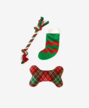 Setul cadou pentru animale verde include jucării care încurajează mișcarea și joaca. Frânghia este ideală pentru tras, iar osul moale în carouri pentru ros. Este un set de distracție care aduce energie și veselie.