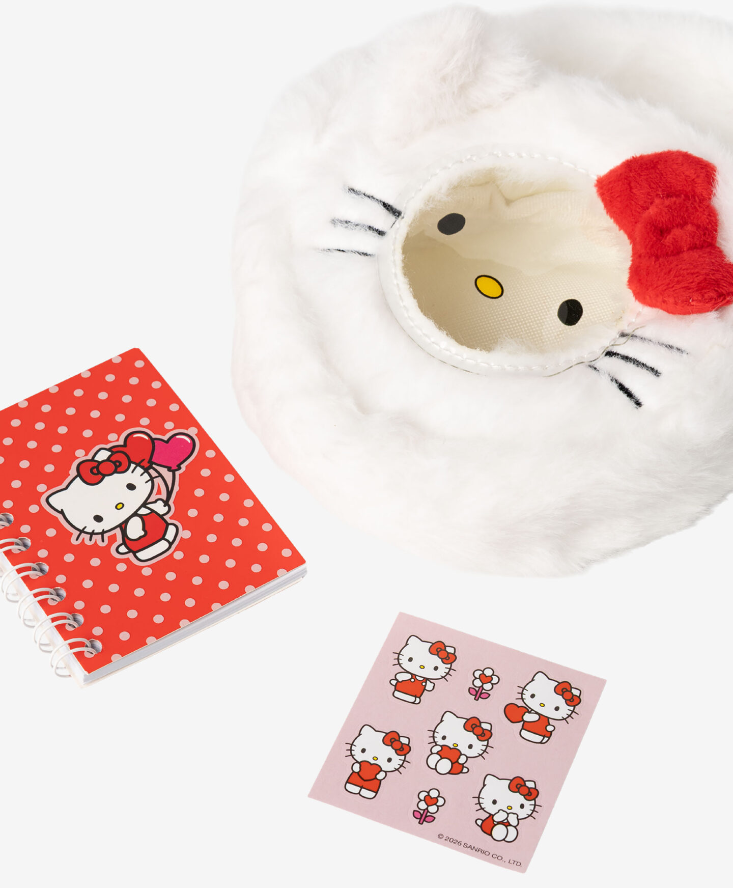 Setul cu licență Hello Kitty, format dintr-un portofel pufos și un caiet cu stickere, este compact, adorabil și ușor de luat oriunde. Portofelul este prevăzut cu mâner și decorat cu funda roșie emblematică a personajului.