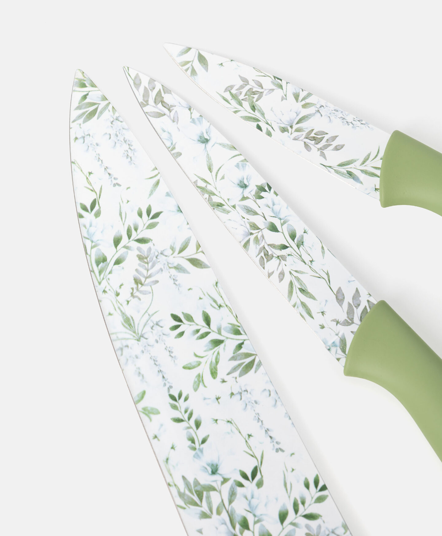 Un set de cuțite este format din trei piese, de dimensiuni diferite, care îți vor ușura gătitul de zi cu zi. Sunt excelente pentru tăierea cărnii, peștelui, legumelor și fructelor, dar și pentru tocarea ierburilor aromatice. Oțelul inoxidabil își păstrează ascuțimea mult timp, este ușor de curățat și rezistent la utilizare zilnică. Mânerul ergonomic, în verde pastel, și lama decorată cu un motiv de primăvară vor adăuga culoare bucătăriei tale. În ofertă găsești și tocătoare asortate.