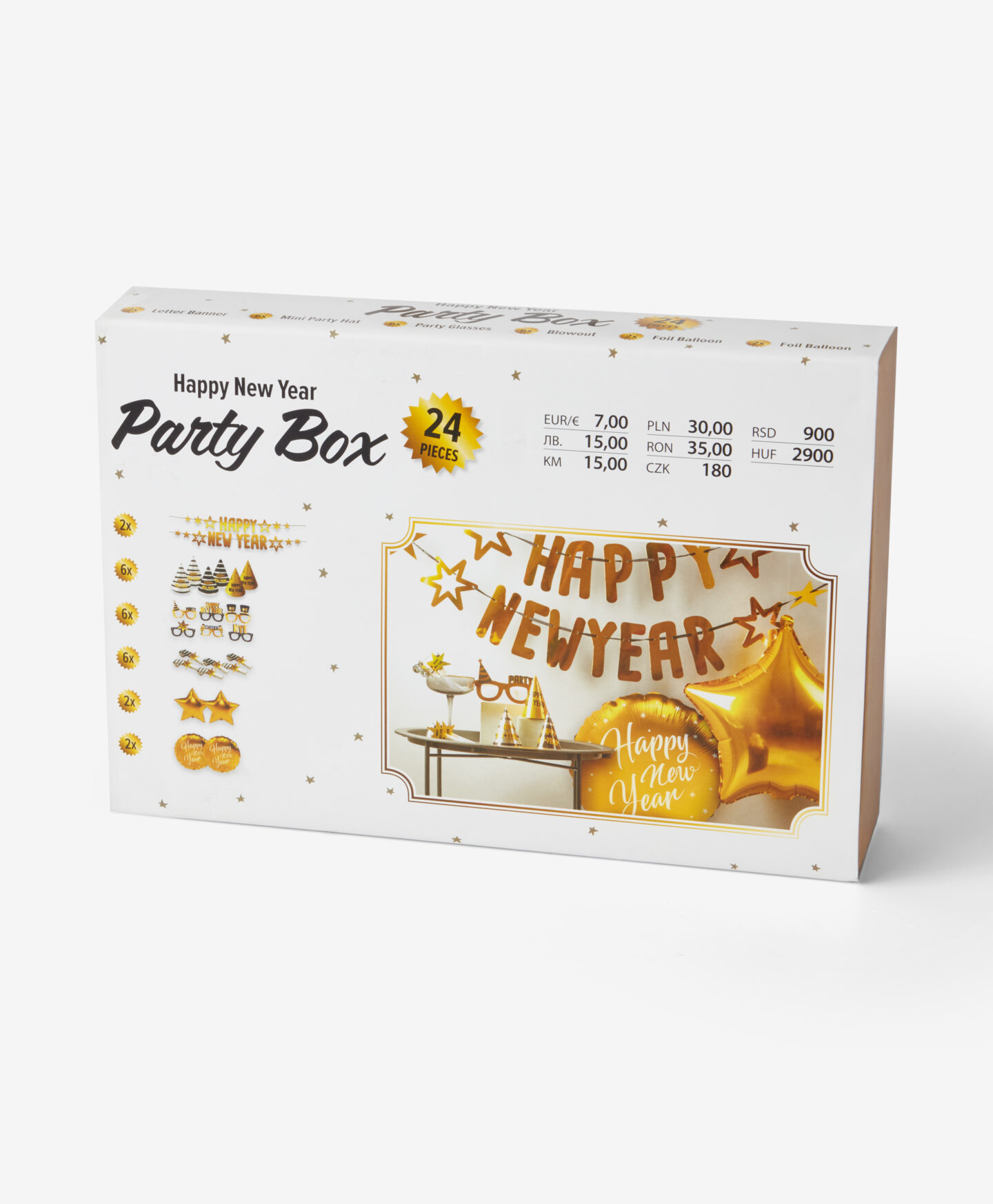 Setul de decorațiuni pentru Revelion conține 24 de elemente care te vor ajuta să organizezi o petrecere de neuitat. Include ochelari amuzanți, pălării, trompete, o ghirlandă și baloane în forme variate. Întâmpină Noul An cu stil!
