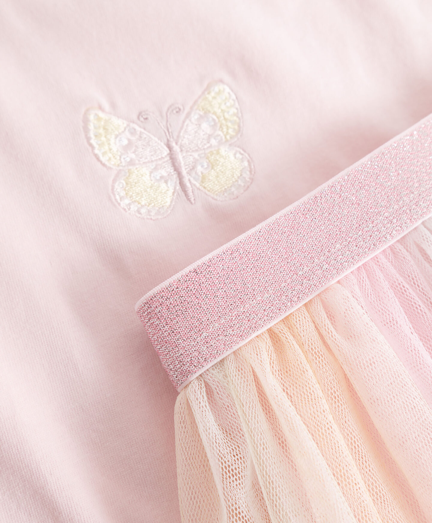 Setul pentru fete este atât de lejer încât oferă senzația de libertate totală. Bluza scurtă, cu mâneci largi și croială dreaptă, asigură libertate de mișcare. Fusta din tul este ușoară și vaporoasă, iar talia elastică garantează potrivire perfectă.