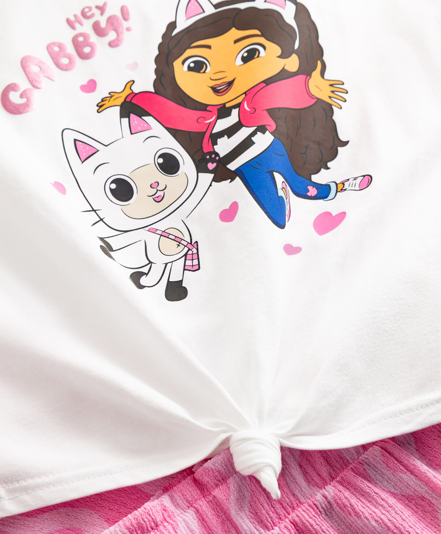 Setul pentru fete cu licență Gabby’s Dollhouse este o alegere modernă care va fi pe placul micilor iubitoare de stil. Tricoul cu nod și imprimeu cu personajele preferate atrage privirea. Este o ținută completă, perfectă pentru grădiniță, locul de joacă sau plimbări în familie în zilele însorite.